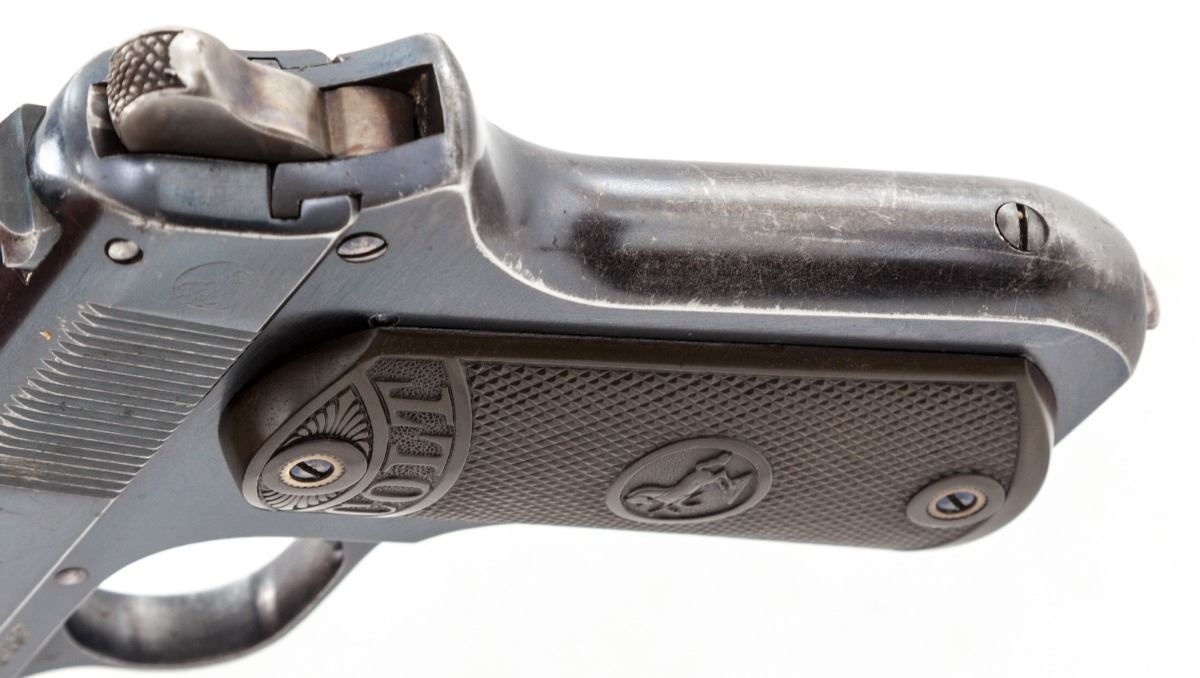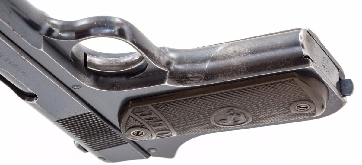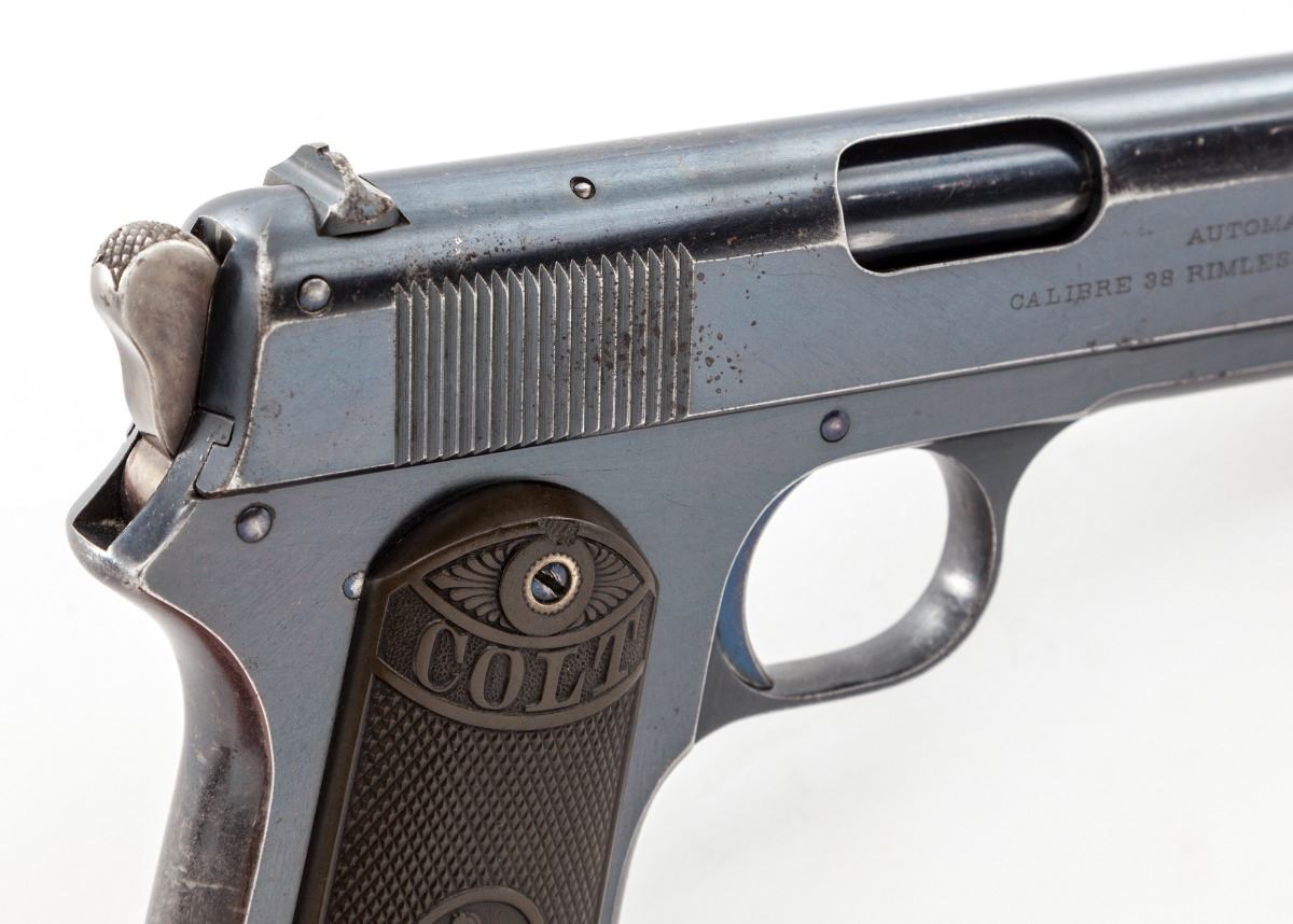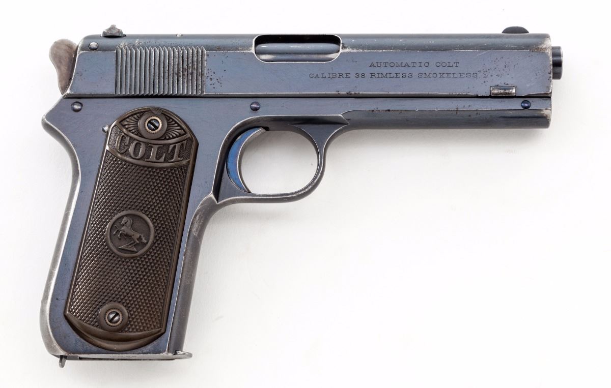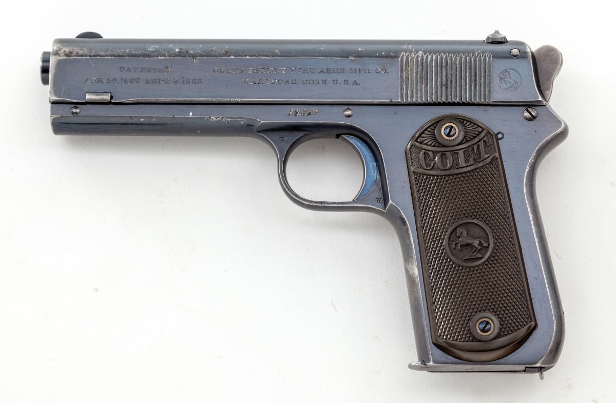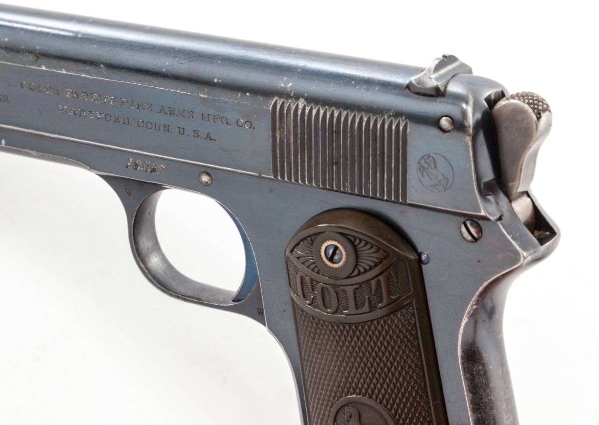 Colt Model 1903 Pocket Hammer Semi-Automatic Pistol, #16467, .38 ACP cal., 4.25'' barrel, blue finish, checkered hard rubber grips, with Colt ''VP'' proofmark, 1902 patent date, two-line address and Rampant Colt in circle on left side of slide, and ''Automatic Colt/Calibre .38 Rimless Smokeless'' on right side of slide. Mfg'd 1903, first year of production. Condition is excellent retaining approx. 85% original factory blue, with losses to the high edges and grip straps and scattered light scratches and dents. Trigger, pins and screws show approx. 90% fire blue, with some case colors remaining on the early rounded hammer. Grips have lightened in color and show very slight wear to the high points. Action is tight, bore is bright. A very nice example of a 113-year-old Colt. Est.: $1,500-$2,500. (C&R)