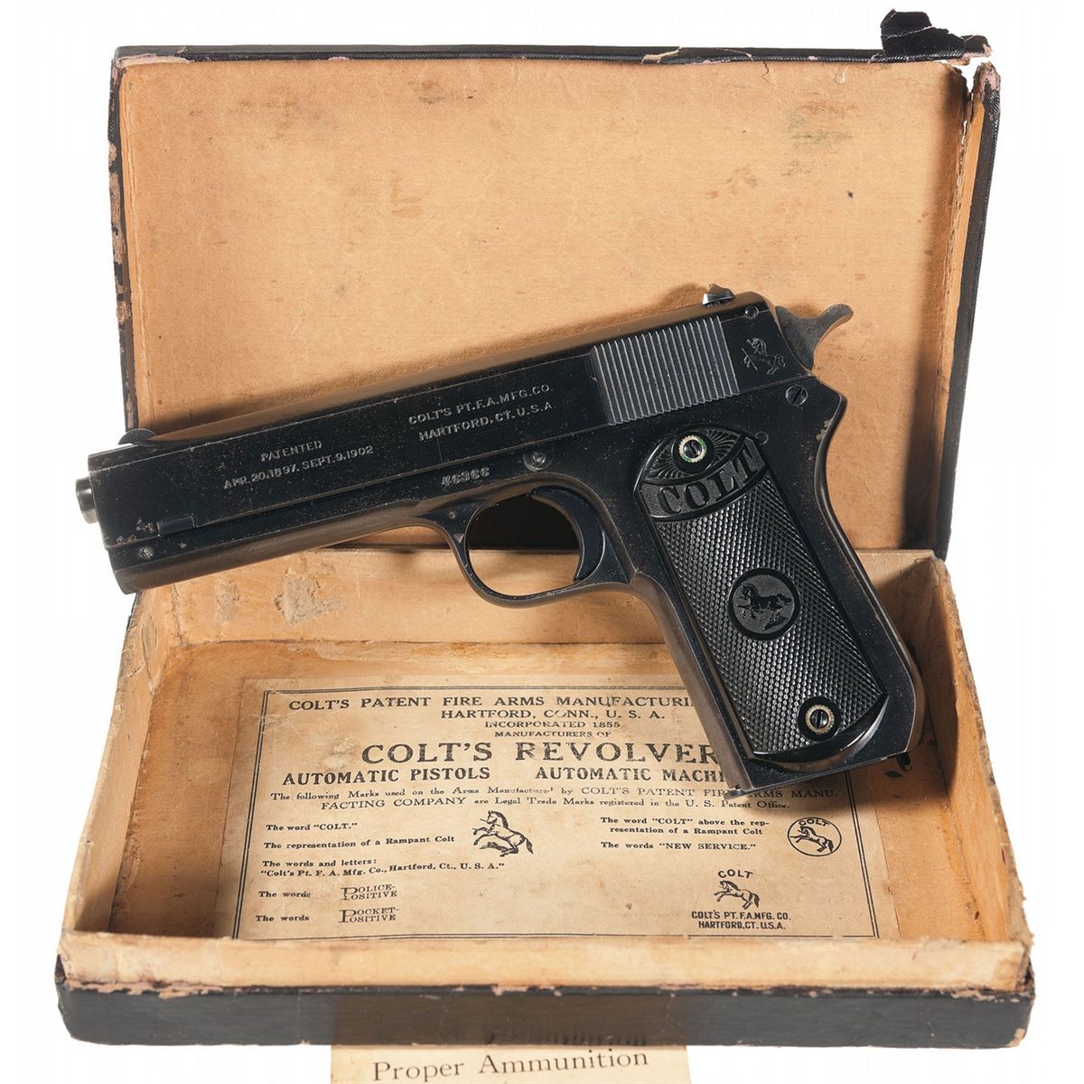 Manufactured in 1926. Standard slide markings with trigger guard bow marked with the number "1" over the Colt triangle "VP" proof. Fitted with original grips featuring the Colt banner and circled Rampant Colt. The blue magazine is marked "PKT/COLT/38 CAL." The original box is numbered to the gun with the "Proper Ammunition" paper sheet and what appears to be an old retailers label on the lid, illegible except for the city "Milwaukee".