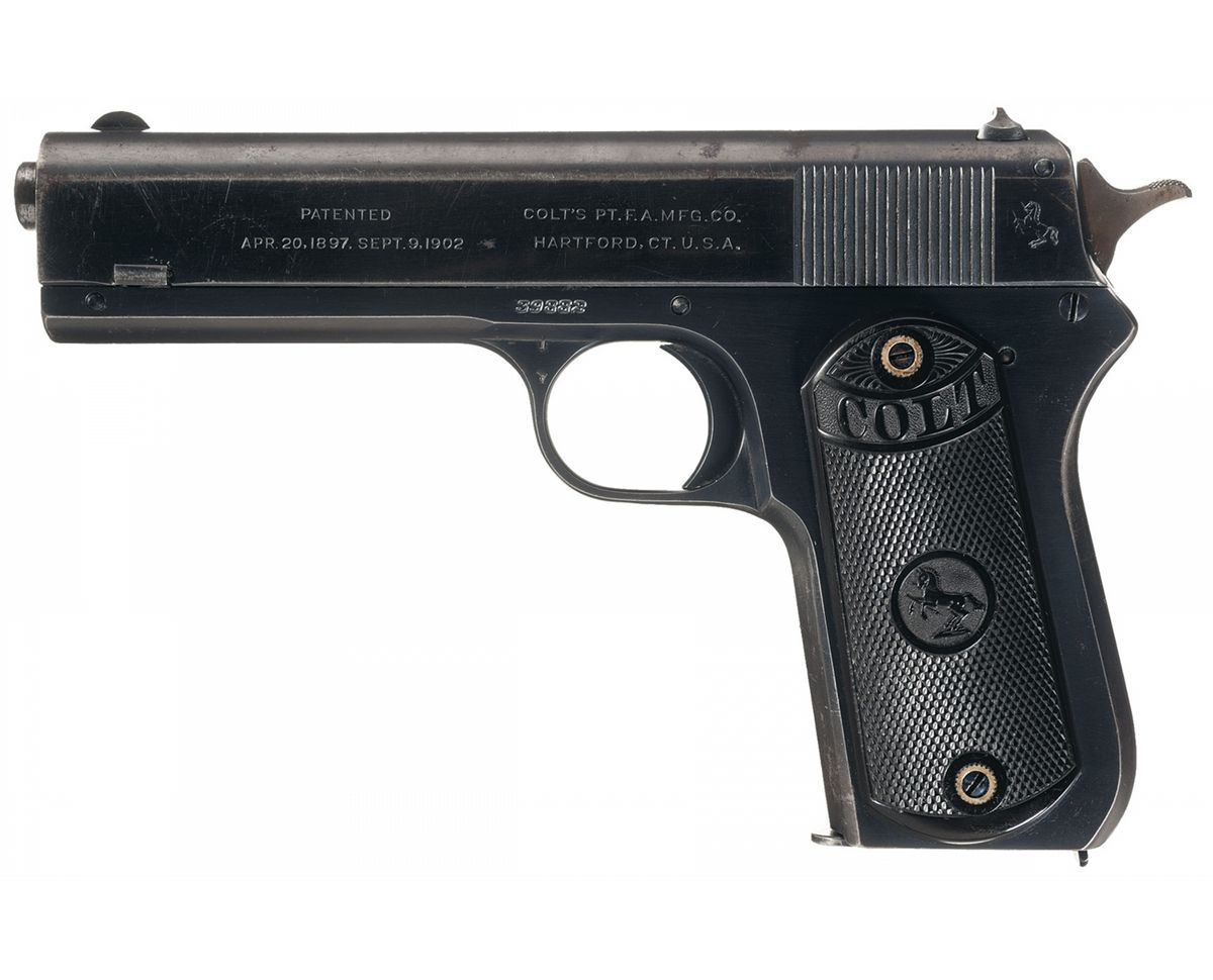 This example was manufactured in early 1918. The left side of the slide is marked with the two block, two line 1897 and 1902 patent dates and address with the Rampant Colt behind the serrations and caliber designation on the right side. The serial number is marked on the left side of the frame and the left side of the trigger guard bow is marked with the number "1" over the Colt triangle "VP" proof. Fixed sights with the rounded edge rear blade. Fitted with the original hard rubber grips with the Colt banner at the top and circled Rampant Colt in the center. Colt marked blue magazine. Also includes an extra set of original hard rubber grips.