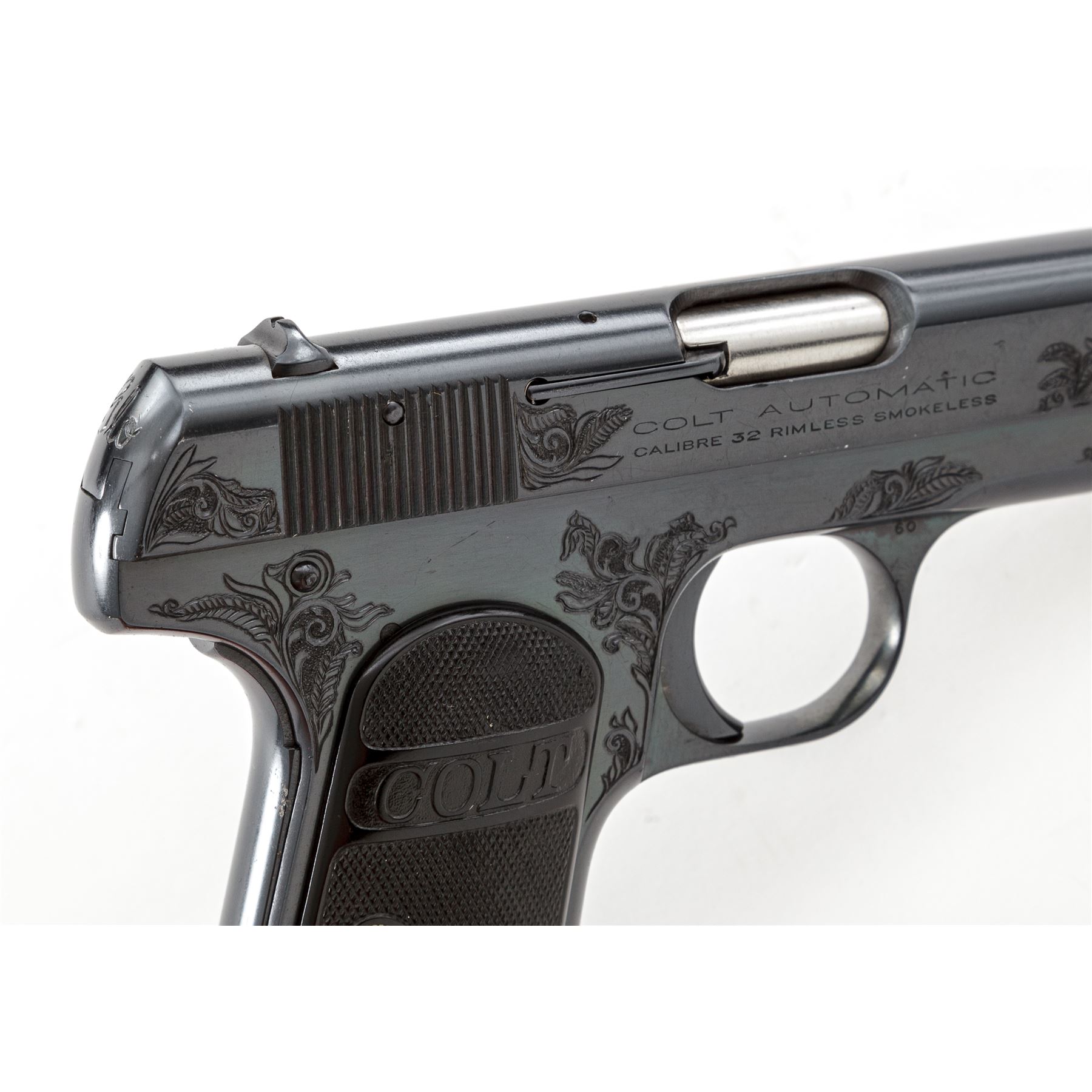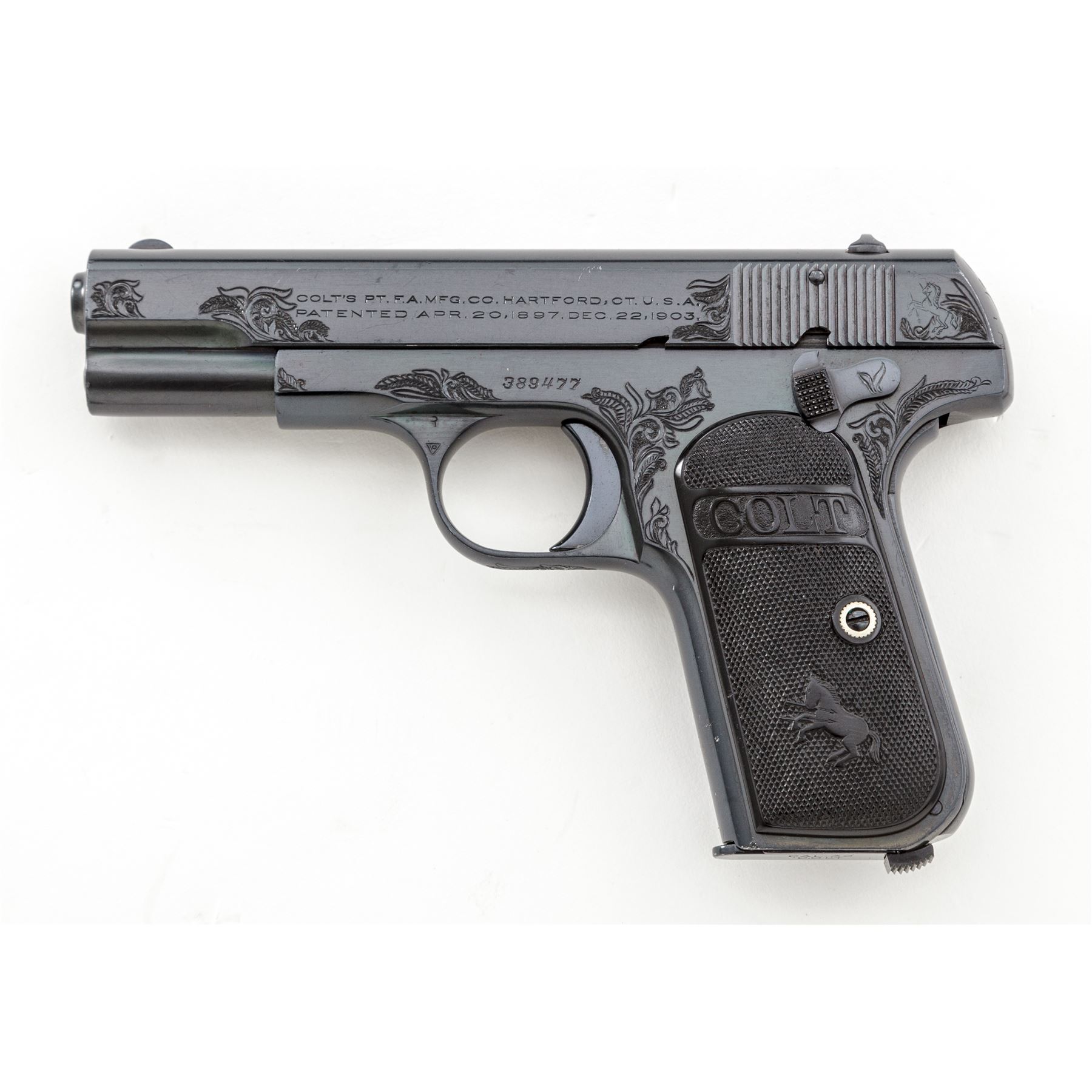 Colt Model 1903 Pocket Hammerless Semi-Automatic Pistol, #389477, .32 ACP cal., 4.75'' barrel, blue finish, factory checkered hard rubber grips, with factory magazine marked ''Cal.32/Colt''. Mfg'd 1921. Condition is fine with later-added non-factory scroll engraving, giving approx. one-quarter coverage, otherwise, approx. 97% original factory blue is retained. Grips with only minor impressions. Magazine appears to have been refinished with non-standard follower. Action is crisp, bore is bright. Est.: $750-$1,000. (C&R/PPT)