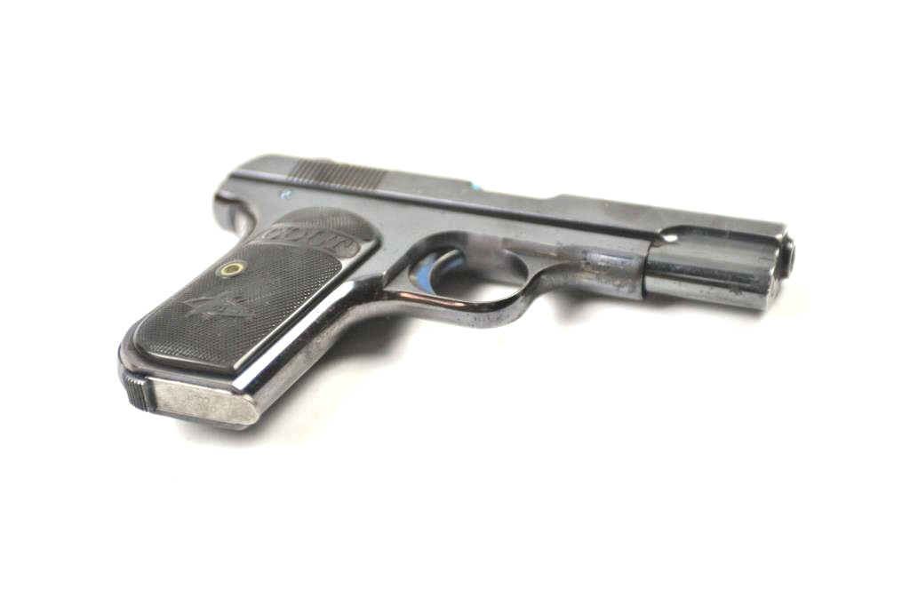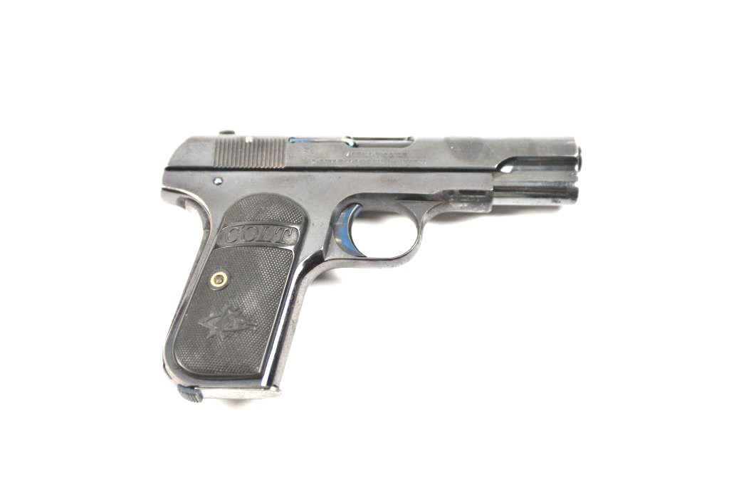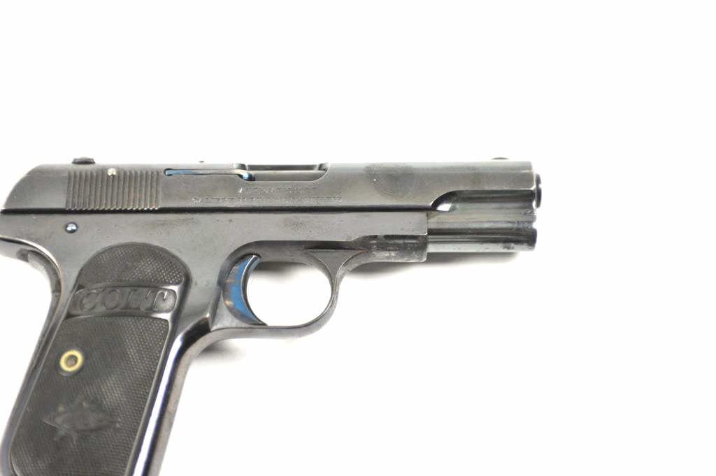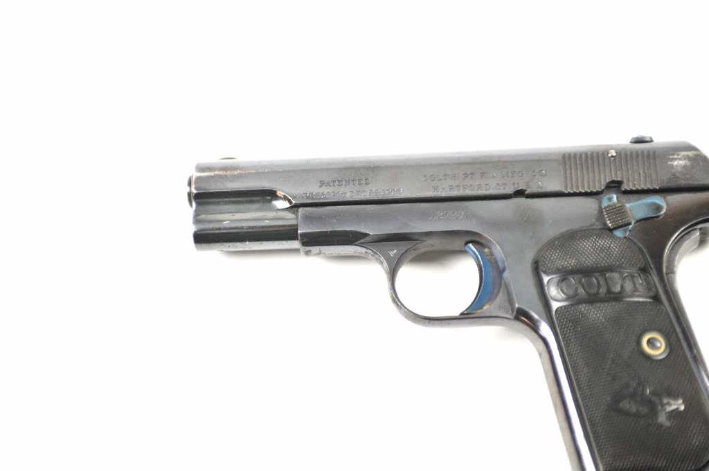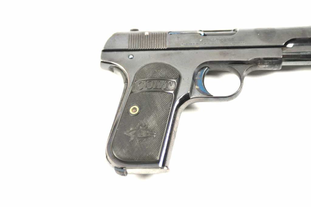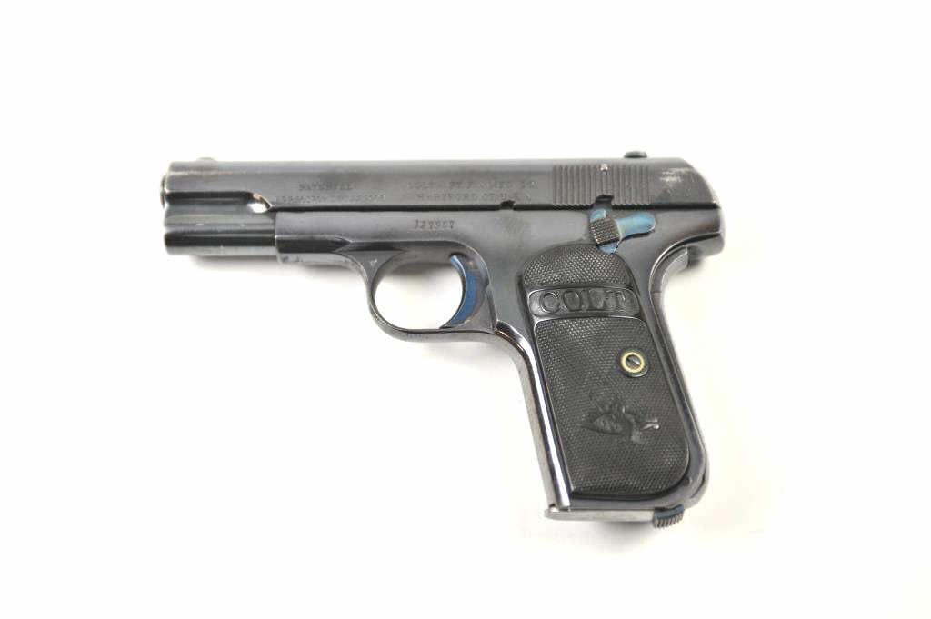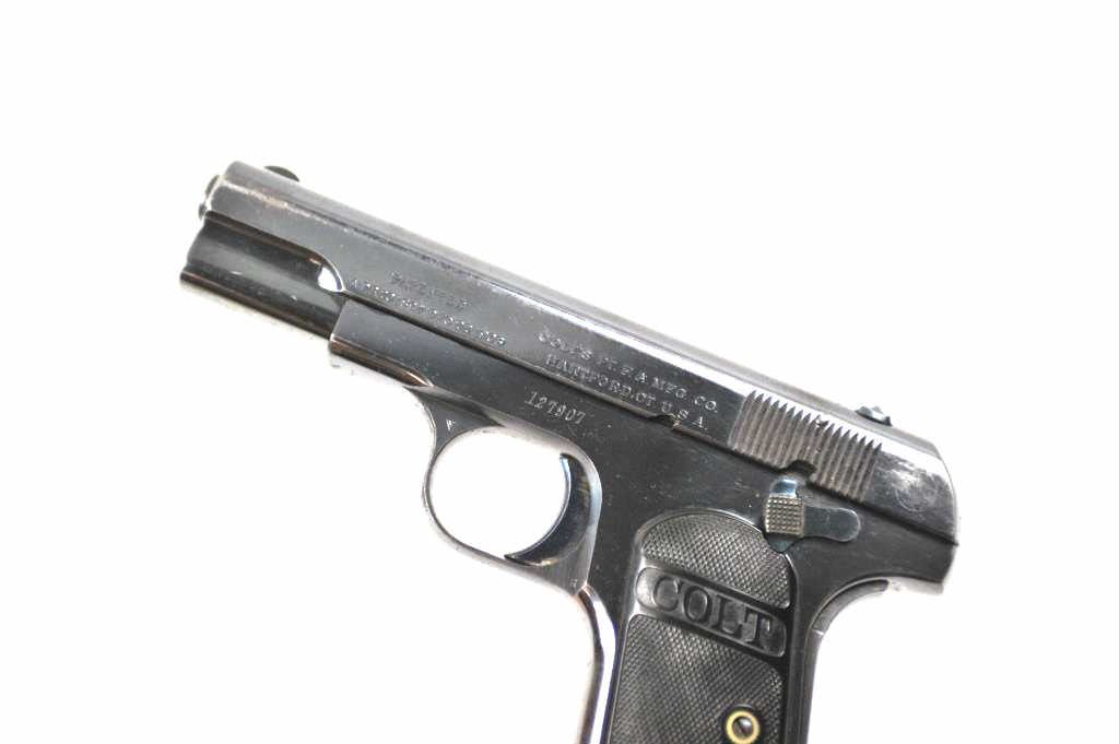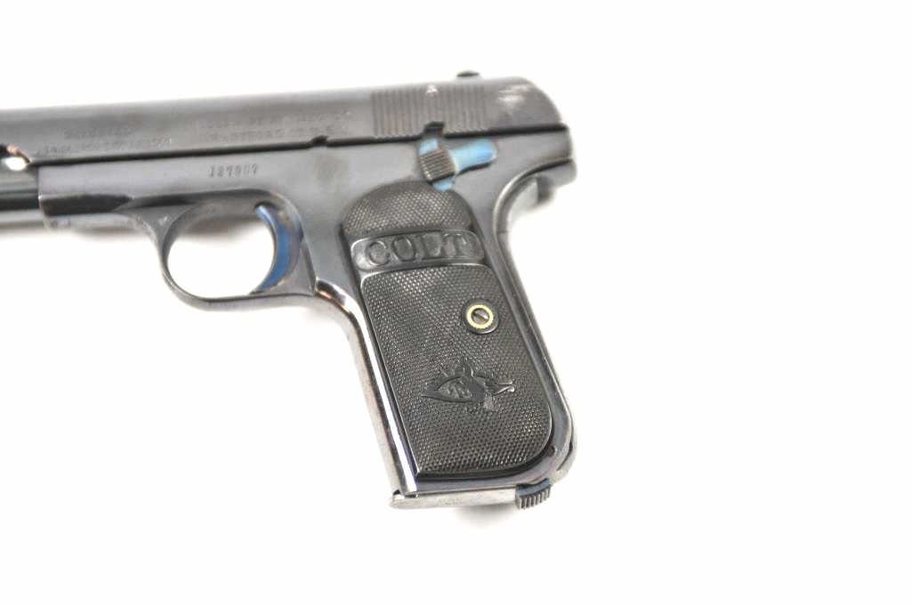 Colt Model 1903 Pocket Hammerless semi-automatic pistol, .32 ACP caliber, Serial #127907. The pistol is in fine overall condition with a 4” barrel. This early Model 1903 pistol retains approximately 85-95% of the high polish blue finish with holster wear at the muzzle and at the rear of the slide. The trigger and other small parts show bright niter blue. The Colt marked checkered hard rubber grips are invery good condition. The bore is good, the action is crisp and the markings are sharp. The lot includes one correct Colt marked magazine. Est.: $600-$1,200. (C+R/PPT).