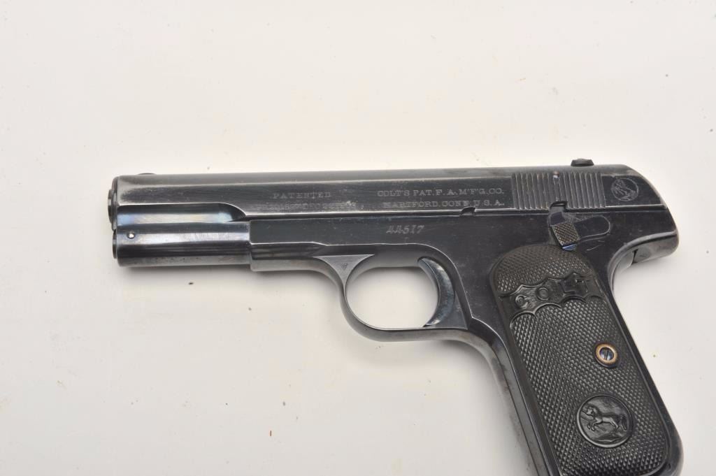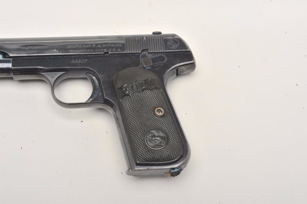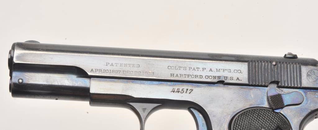 Colt Model 1903 Pocket semi-automatic pistol, .32 caliber, 4” barrel with desirable barrel bushing, high polish blued finish, checkered hard rubber grips, S/N 44517, accompanied by a brown covered cardboard factory box. Thegun is in overall fine condition showing the majority of its original finish with some high point wear and some scratching behind the ejection port on the slide; the bore is very good to fine, action crisp and markingssharp; the grips are also fine overall. The box is missing one side panel, shows some taping and edge wear, minor losses, etc. (C&R/PPT). Est.: $1,250-$2,500.