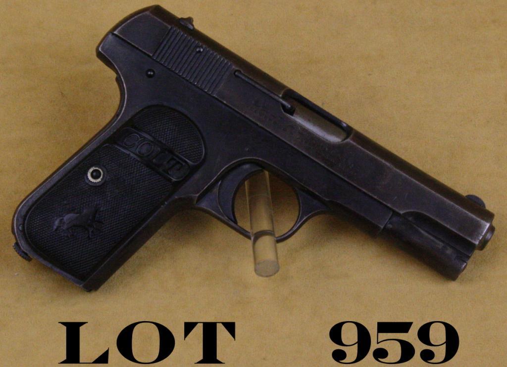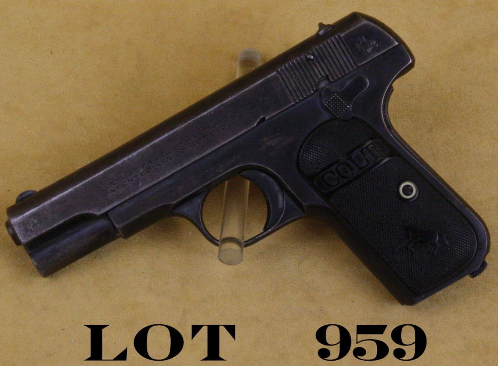 Colt Model 1903 pocket semi-auto pistol, .32 cal., 4” barrel, blue finish, checkered Rampant Colt black hard rubber grips, #367880. This gun is in overall fair + condition showing approx. 40% muted bluefinish with balance gone to a brown patina with some scattered areas of erosion and pin prick pitting; bore is worn and shows a ring of pitting toward the muzzle, good action and markings, grips are overall fair + showingwear and some old mars and scratches; magazine is slightly loose; would benefit from some careful TLC. Est.: $200-$300.