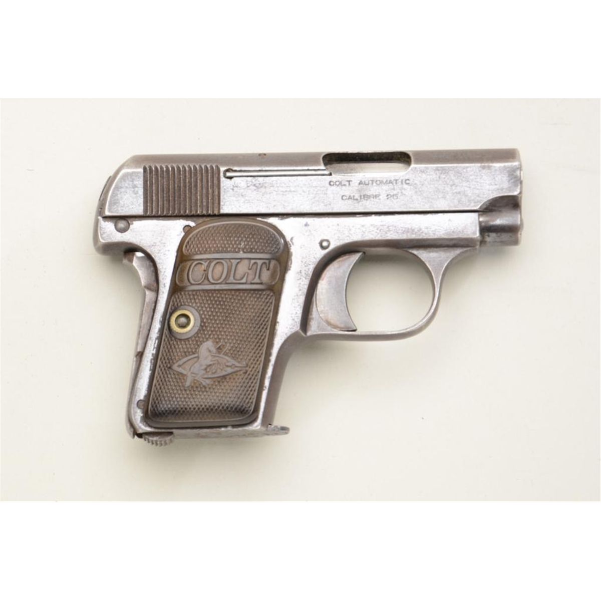 Colt Model 1903 semi-auto pistol, .25 cal., 2” barrel, blue finish, checkered hard rubber grips, #87773. This gun is in overall fine condition showing approx. 70% original blue finish, good bore, crisp action, very goodmarkings, very good grips; magazine shows some surface rust on butt that should clean. Est.: $275-$375.