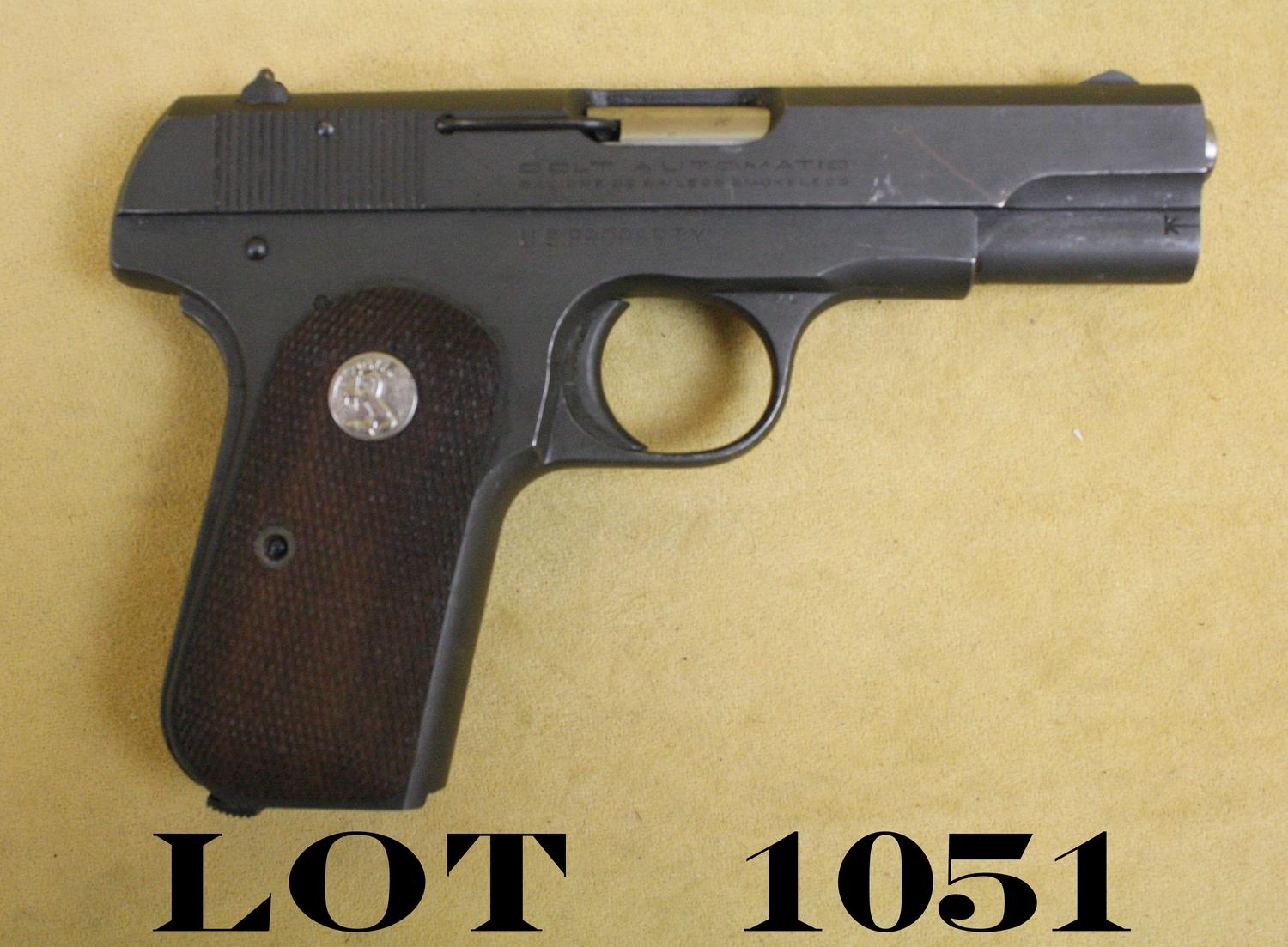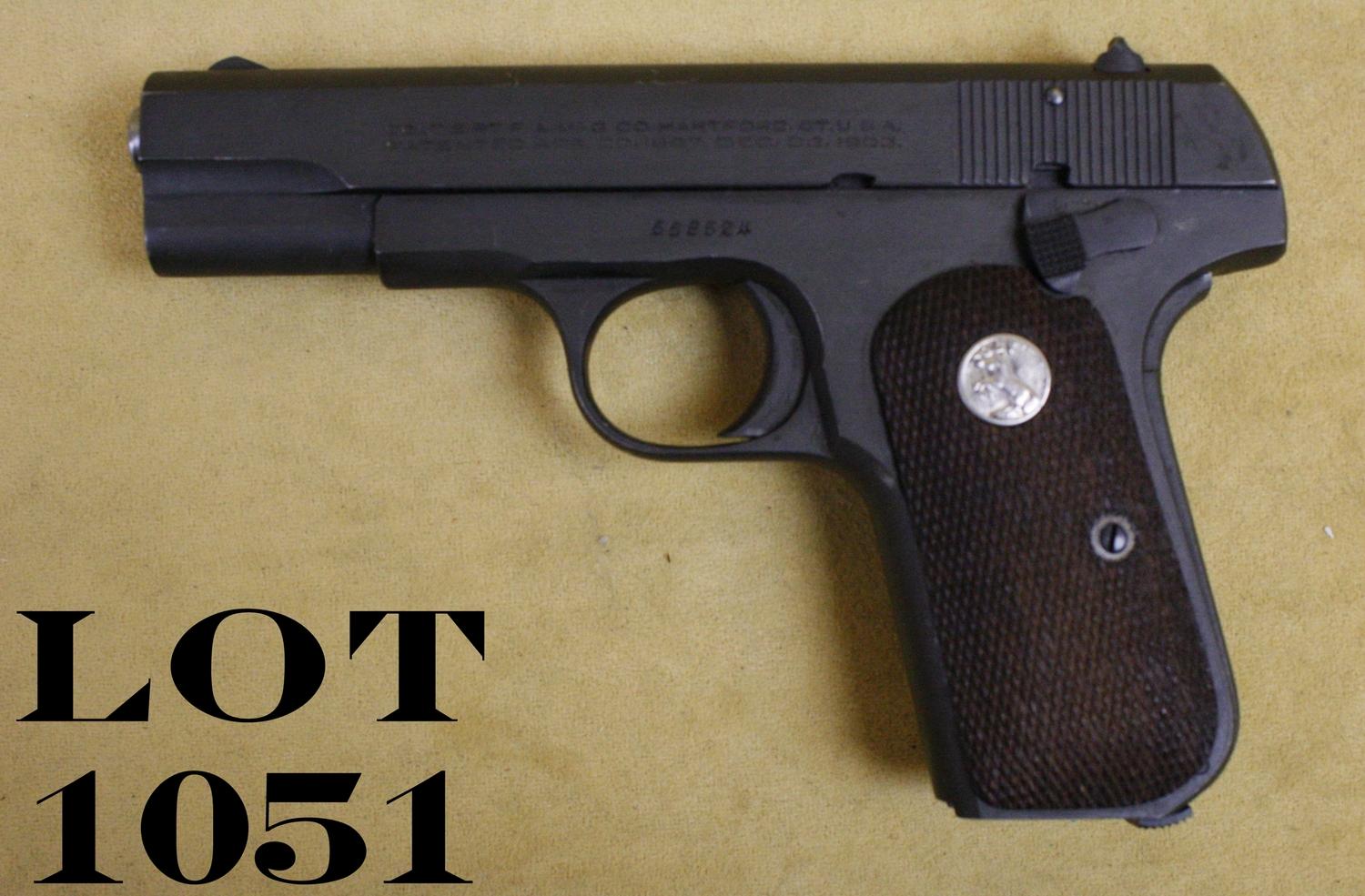 Colt Model 1903 semi-auto pistol, .32 ACP cal., U.S. Property marked, military finish, in Kraft box with papers, #568524. The pistol shows 98%-99%+ original arsenal finish, some slight edge wear and oxidation, excellentgrips, pristine interior, blued clip, military proofed and US Property on frame. Just some slight operation handling and minor use. In General Officer serial number range. No information available on recipientat time of cataloging; should be further researched. Est.: $1,500-$3,000.