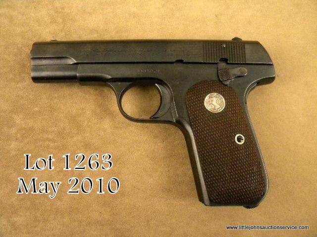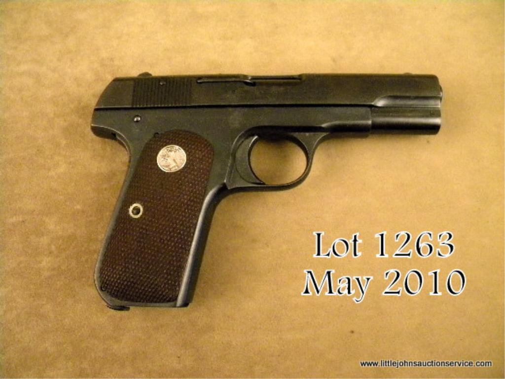 Colt Model 1903 semi-auto pistol, .32 ACP cal., re-blued finish, checkered wood medallion grips, #466759. The pistol shows 98%-99% re-blued finish, some pitting beneath the blue, good markings and grips, correct clip, excellent bore. Est.:$200-$400.