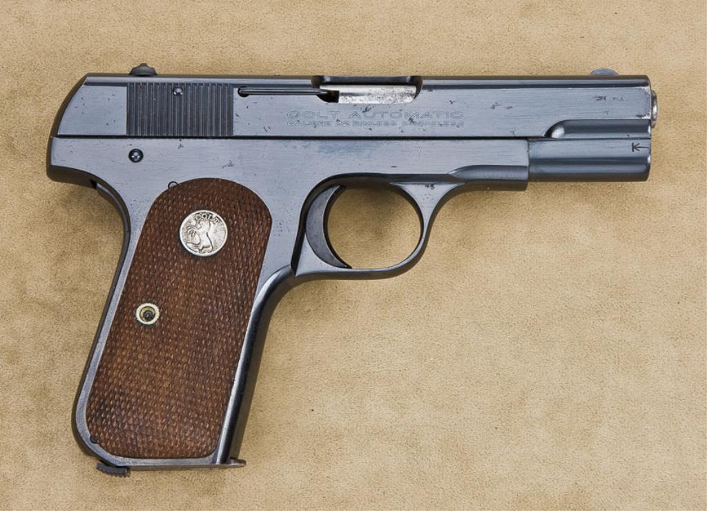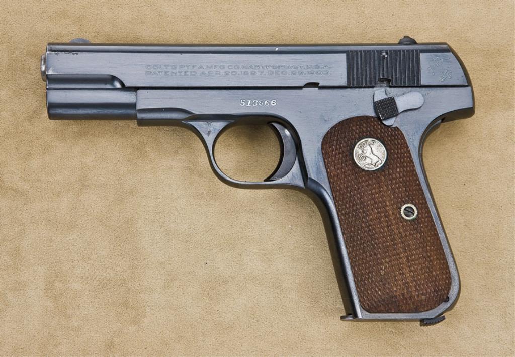 Colt Model 1903 semi-auto pistol, .32 cal., 3-3/4” barrel, blue finish, checkered Colt medallion wood grips, #513866. This gun is in overall fine condition showing approx. 98% original finish with just some slight highpoint wear and a couple of small points of pin prick pitting developing; fine bore, action and markings that have been filled with white lacquer to make them stand out prominently against the blue finish; finegrips, correct magazine, factory instructions and cleaning rod; all contained in a Kraft two-piece cardboard box. Est.: $1,500-$3,000.