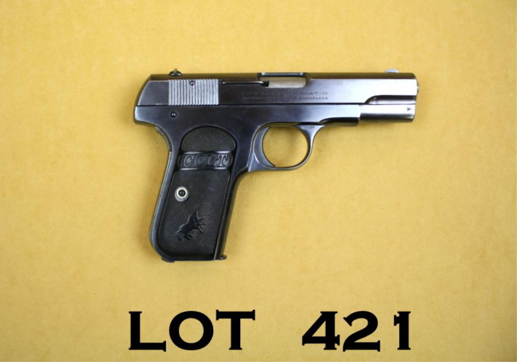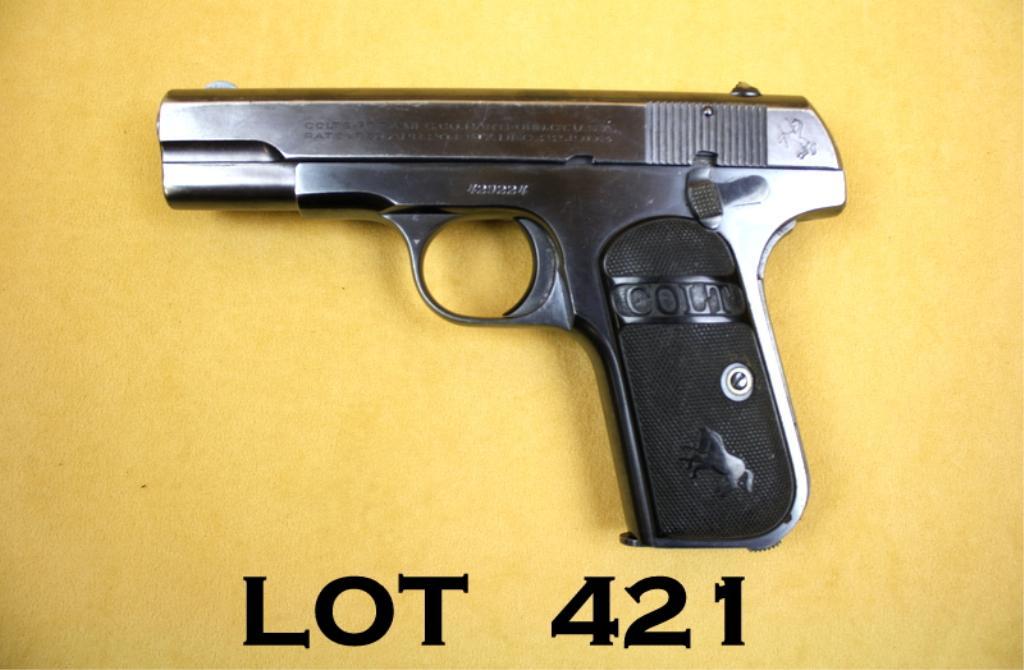 Colt Model 1903 semi-auto pistol, .32 cal., 3-3/4” barrel, blue finish, checkered black hard rubber grips, #429224. This gun is in overall very good condition showing approx. 90% original blue finish, very good bore, markings and grips, crisp action, correct two-tone Colt magazine. A really nice early Colt pocket model. Est.: $250-$500.