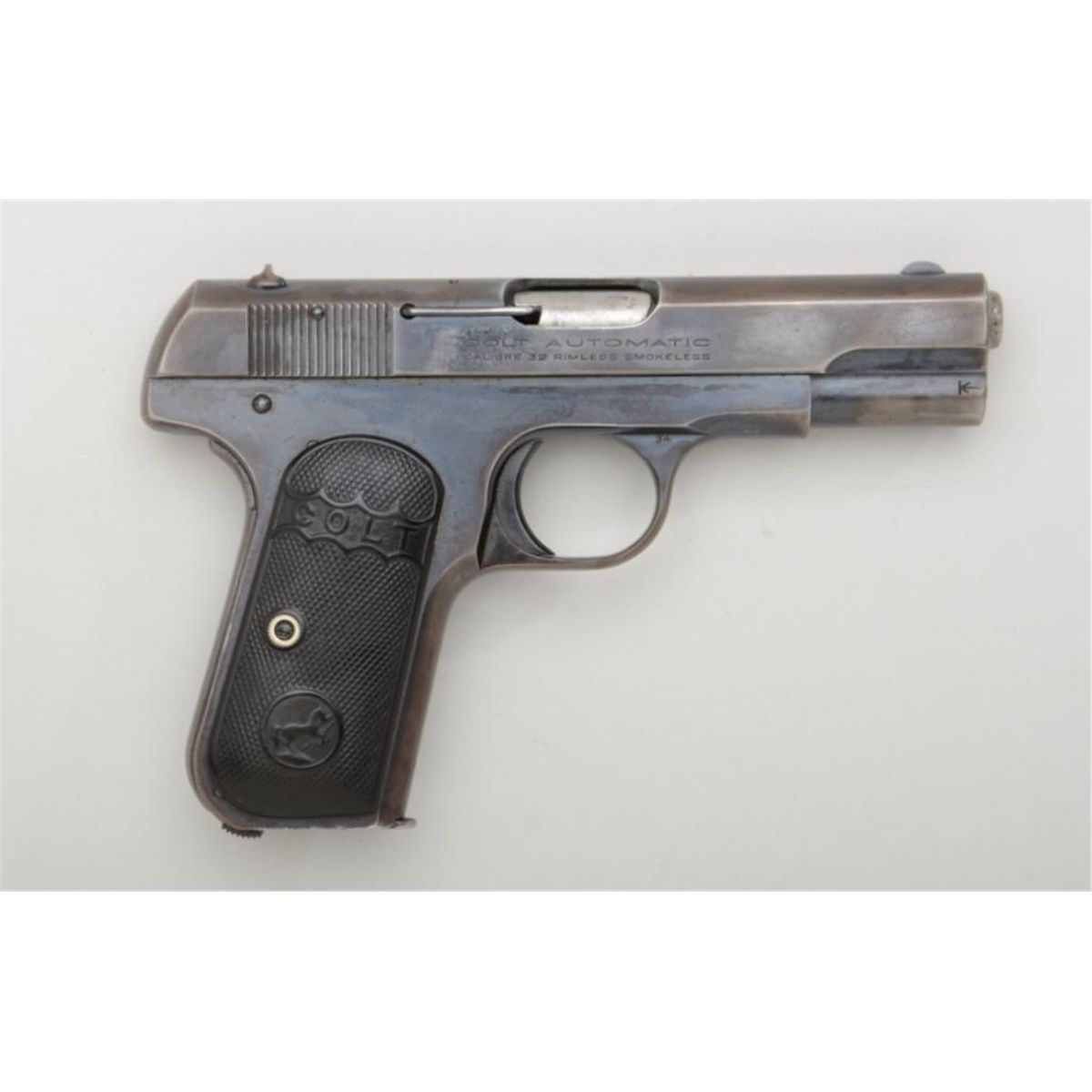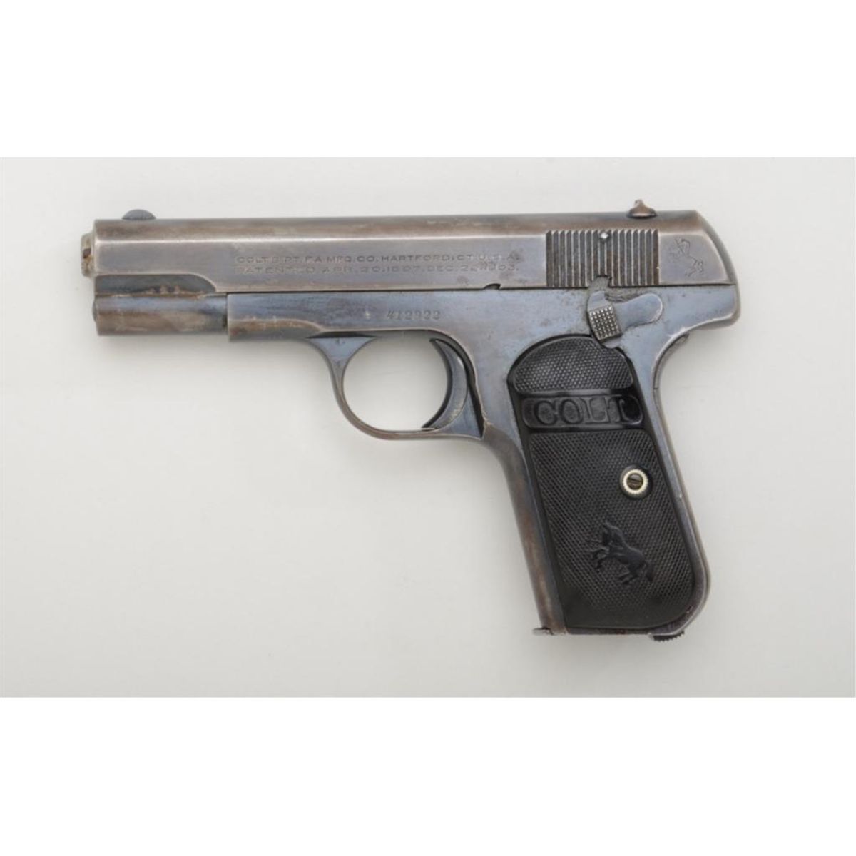 Colt Model 1903 semi-auto pistol, .32 cal., 3-3/4” barrel, blue finish, checkered early Colt hard rubber grips, #412922. This gun is in overall good to very good condition showing approx. 40% original finish withbalance gone to a brown patina, very good action and markings, fair bore, two-tone magazine, grips are good with an early Colt grip style on the right side and the later rampant Colt grip on the left side. Est.:$300-$600.