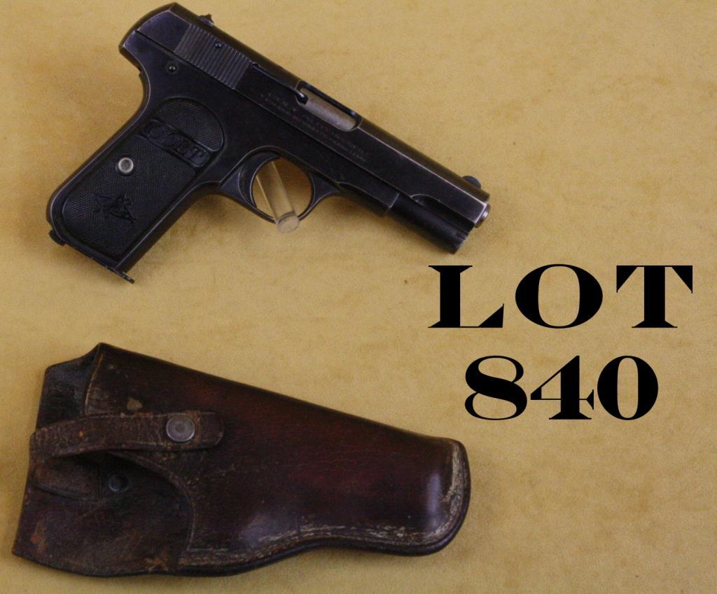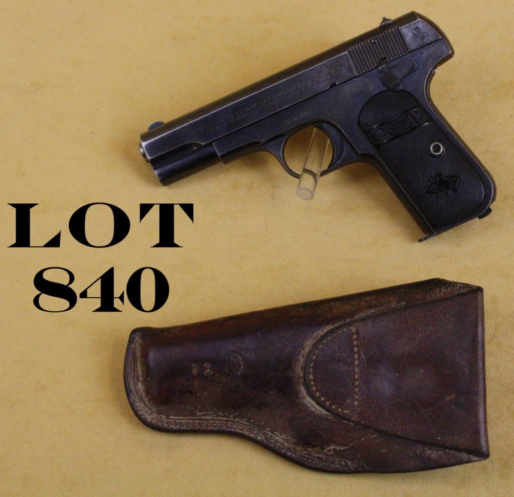 Colt Model 1903 semi-auto pistol, .32 cal., 4” barrel, blue finish, checkered Colt hard rubber grips, #372962 with brown leather holster marked “Hollywood Saddlery” and “32”. This gun is in overall good conditionshowing approx. 80% muted original blue finish, good bore, action and markings, overall good grips showing some even wear; after market replacement magazine. Est.: $120-$250.