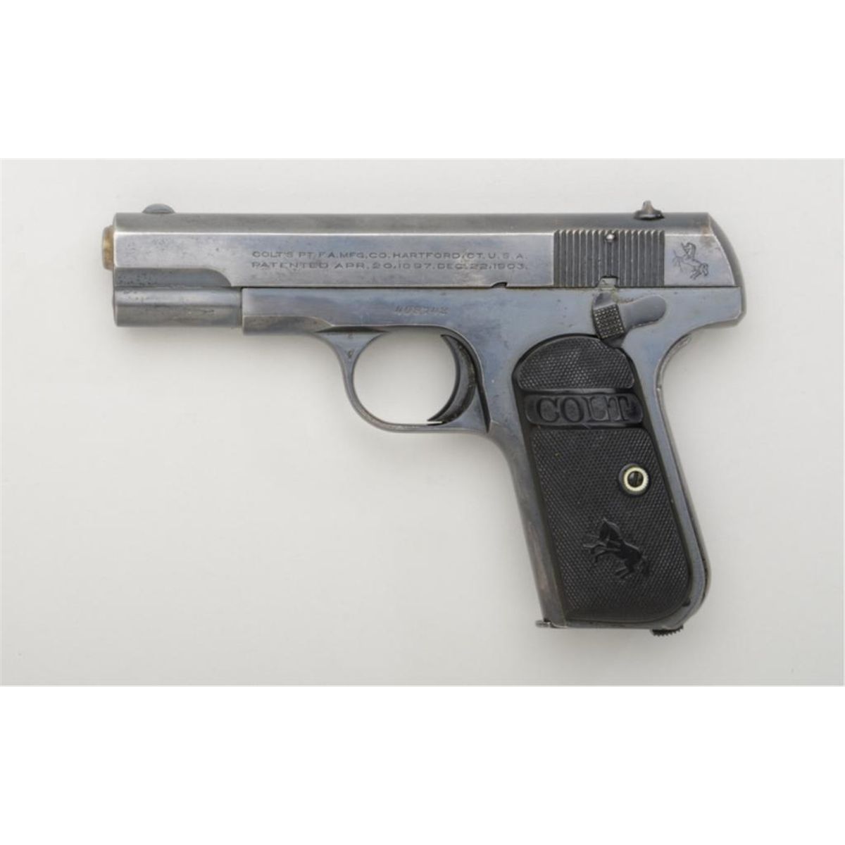 Colt Model 1903 semi-auto pistol, .32 cal., 4” barrel, blue finish, checkered hard rubber grips, #408742. This gun is in overall fine to excellent condition showing the majority of its original finish with some high pointwear and losses to the straps and slide; fine bore, crisp action, sharp markings, fine grips; two-tone magazine. Est.: $350-$700.