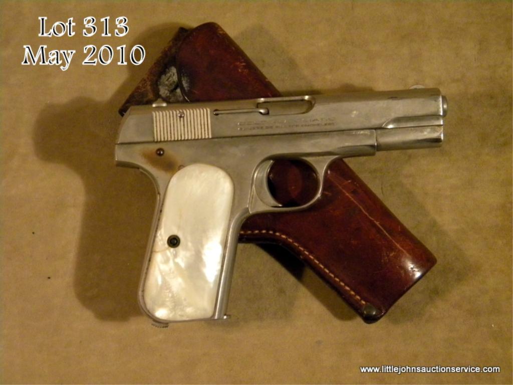 Colt Model 1903 semi-auto pistol, .32 cal., 4” barrel, nickel finish, pearl grips, #377828. This gun is in overall good to very good condition showing approx. 90% original uncleaned frosted nickel finish with the primary loss areas at therear of the frame that have gone dark brown and appear to have been from carry in the accompanying brown leather holster; there are a couple of points of knackering on the left side of the muzzle and what appears to be a driver’s licensenumber has been lightly scratched on the left side of the frame above the serial number. The bore is very good, the markings sharp and the action is crisp; the grips are very good and show the colorful hues of early factory or dealer additionwith an old hairline crack on the right grip at the escutcheon; correct magazine; holster in overall good condition and marked “H. H. Heiser, Maker, Denver, Colo.”. This gun should clean up nicely with some careful TLC. Est.: $300-$600.