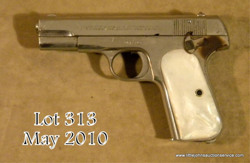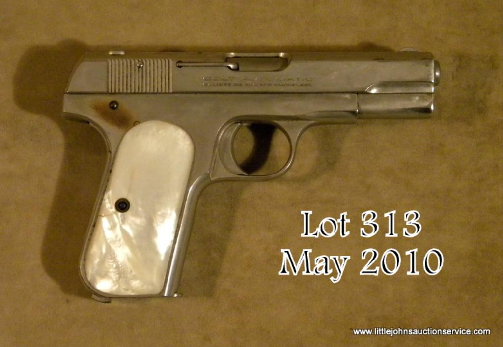 Colt Model 1903 semi-auto pistol, .32 cal., 4” barrel, nickel finish, pearl grips, #377828. This g
