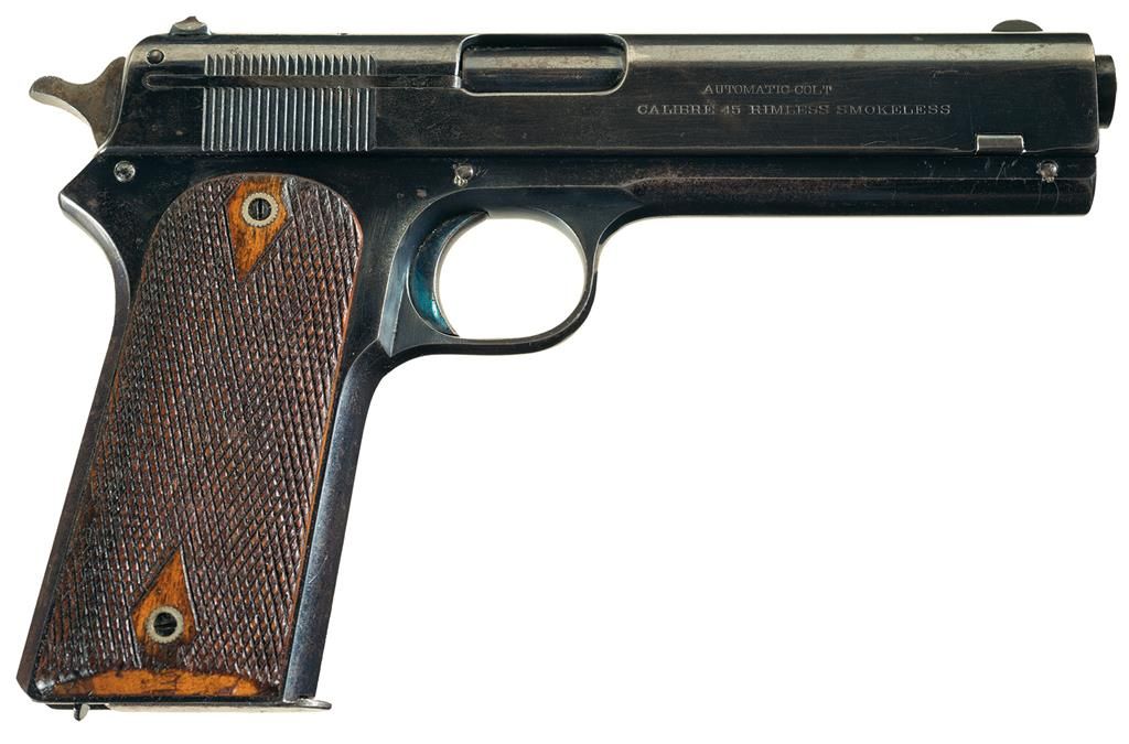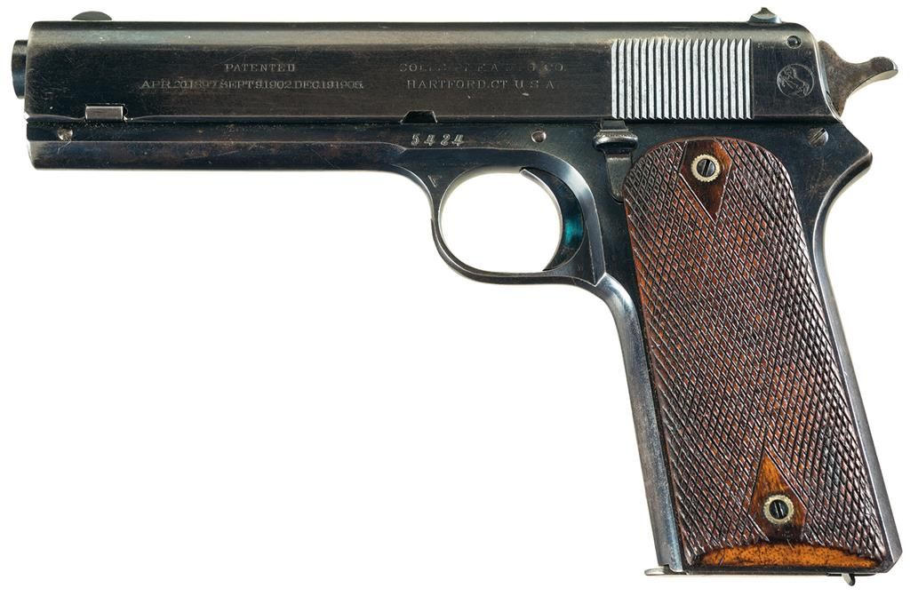 This is an excellent condition Colt commercial Model 1905 Military pistol. This was Colt's first semi-automatic pistol that fired the new 45 ACP round. There were only 6100 manufactured in total with this example made in 1911. This model was the true forerunner to the Model 1911 series of pistol, which was used by the US Government for the next 80 years. The right side of the slide is marked "AUTOMATIC COLT / CALIBRE 45 RIMLESS SMOKELESS" in front of the ejection port, and the left side is marked in two blocks "PATENTED / APR. 20. 1897. SEPT. 9. 1902. DEC. 19. 1905." and "COLT'S PT. F. A. MFG. CO. / HARTFORD CT. U.S.A." with the circled Rampant Colt behind the serrations. The serial number (5424) is located on the left side of the frame above the trigger guard bow. The upper left trigger guard bow bears the Colt "VP/triangle" proof and the lower is marked with a "W". Early spur hammer version with half-cock notch and casehardened finish. The grips are that early light colored checkered walnut versions with the diamond pattern around the screws. The pistols has the Colt high-polish blue finish overall with the trigger, extractor and magazine release, having the Colt niter blue finish. It is complete with one 1905, all blue magazine.