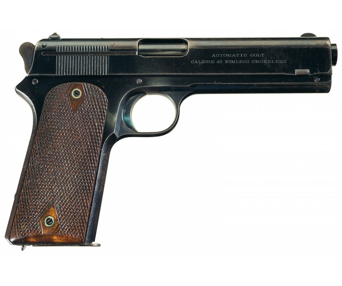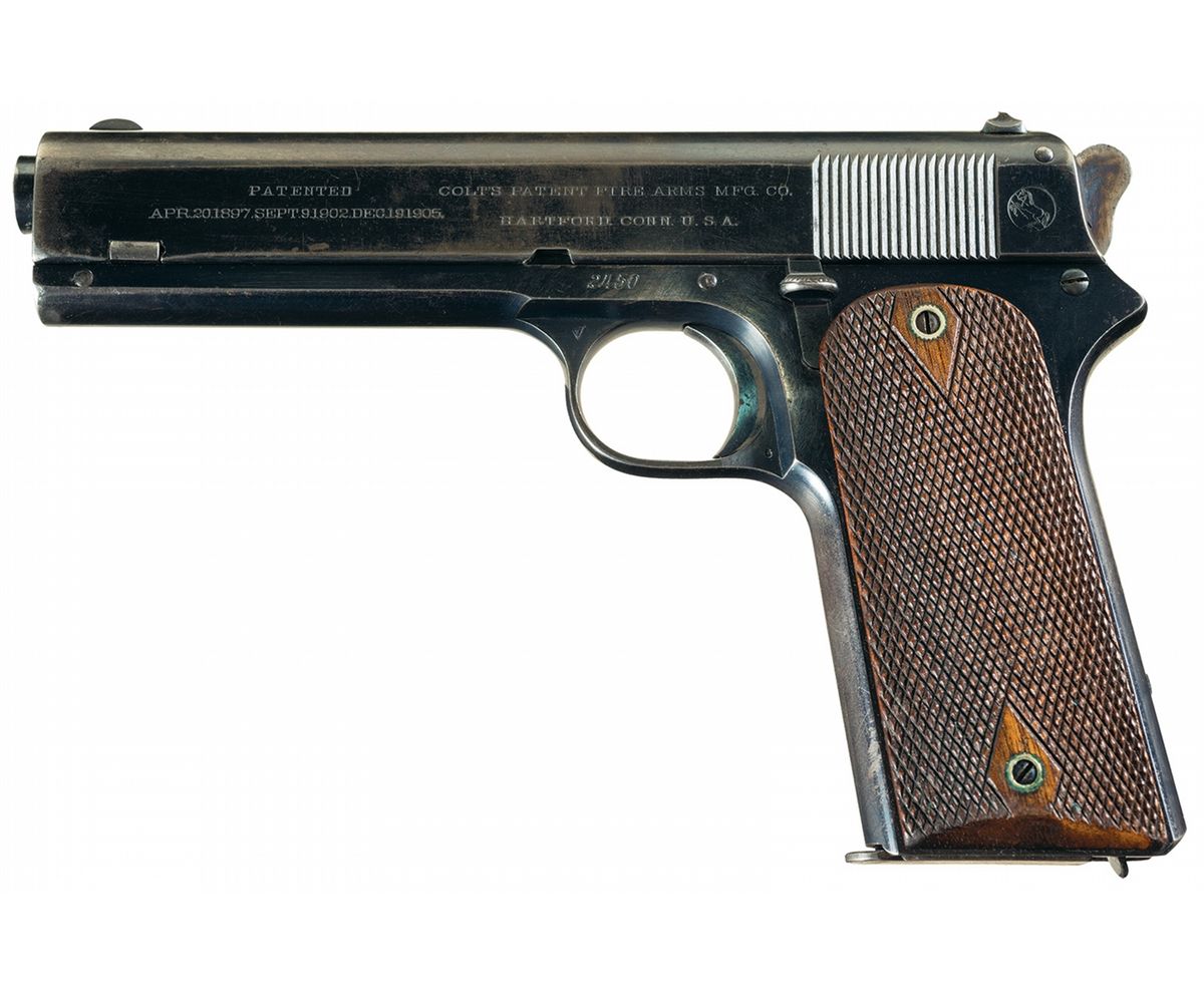 This is an excellent condition Colt Commercial Model 1905 Military pistol. This was Colt's first semi-automatic pistol that fired the new 45 ACP round. There were only 6,100 manufactured in total with this example made in late 1907. This model was the true forerunner to the Model 1911 series of pistol, which was used by the U.S. Government for the next 80 years. The right side of the slide is marked "AUTOMATIC COLT/CALIBRE 45 RIMLESS SMOKELESS" in front of the ejection port, and the left side is marked in two blocks "PATENTED/APR. 20. 1897. SEPT. 9. 1902. DEC. 19. 1905." and "COLT'S PT. F. A. MFG. CO./HARTFORD CT. U.S.A." with the circled Rampant Colt behind the serrations. The serial number "2450" is located on the left side of the frame above the trigger guard bow. The upper left trigger guard bow bares the Colt "VP/triangle" proof and the lower is marked with a "6". Early round spur hammer version with half-cock notch and casehardened finish. The grips are an early light colored checkered walnut versions with the diamond pattern around the screws. The pistol has the Colt high polish blue finish with the trigger, extractor and magazine release, having the Colt nitre blue finish. It is complete with an extra blued magazine with one contained in a small leather pocket pouch. On the back side of the pouch flap "J.R. STROHL/SAN ANTONIO, TEXAS." is written in ink, and below that it is marked "J.A.S.TROHL/P.L.C.S. MESHOPPEN Pa.".