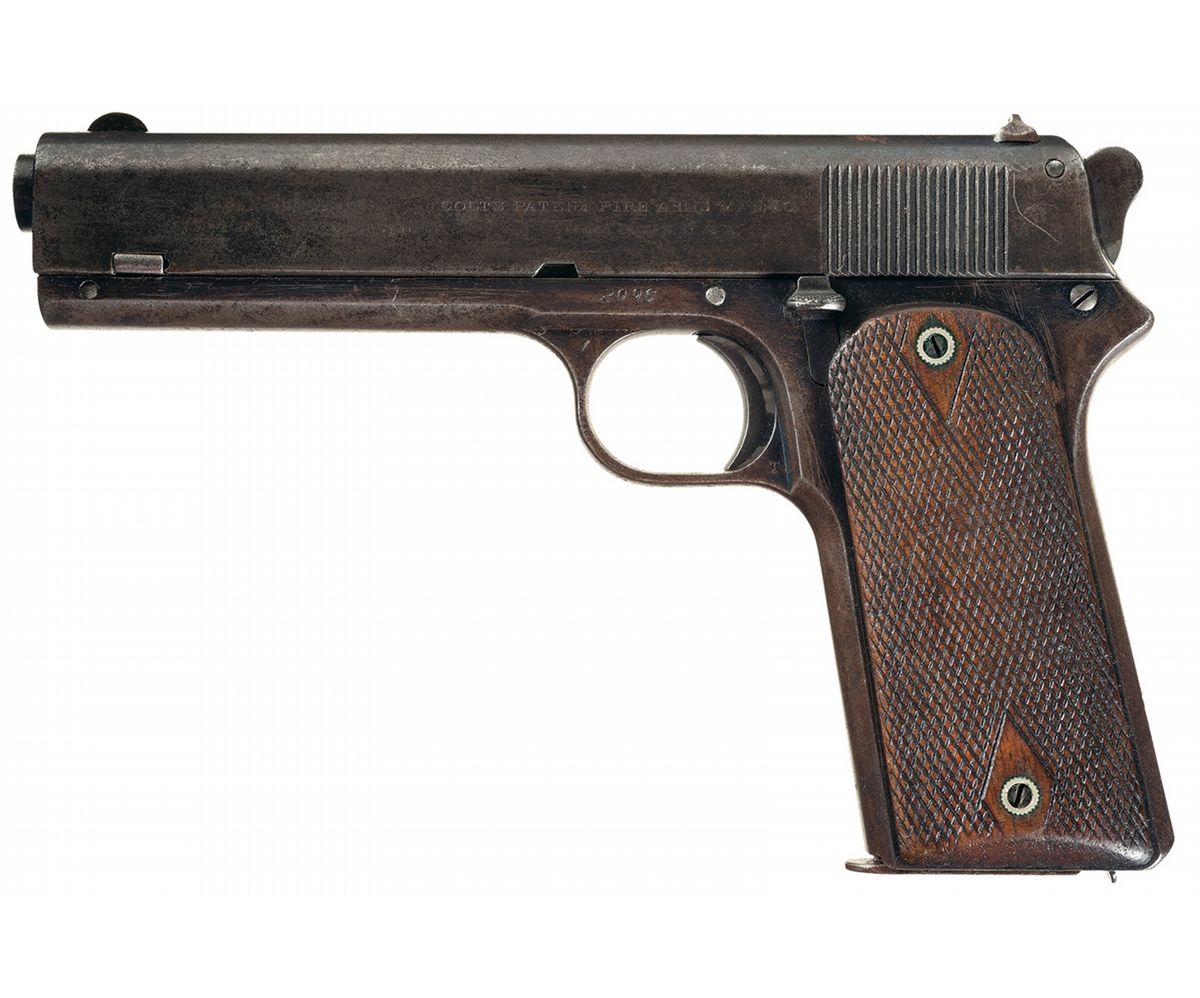 Manufactured in 1907. The slide has the two-line, two-block patent dates/Hartford address markings with a circled Rampant Colt behind the serrations on the left side and the two-line caliber marking ahead of the ejection port on the right side. Trigger guard has the factory triangle proof and the letter "T" on the left side. Checkered grips with diamond pattern around the screws and an unmarked blue magazine. Colt manufactured only 6,300 Model 1905 pistols from 1905 to 1911.