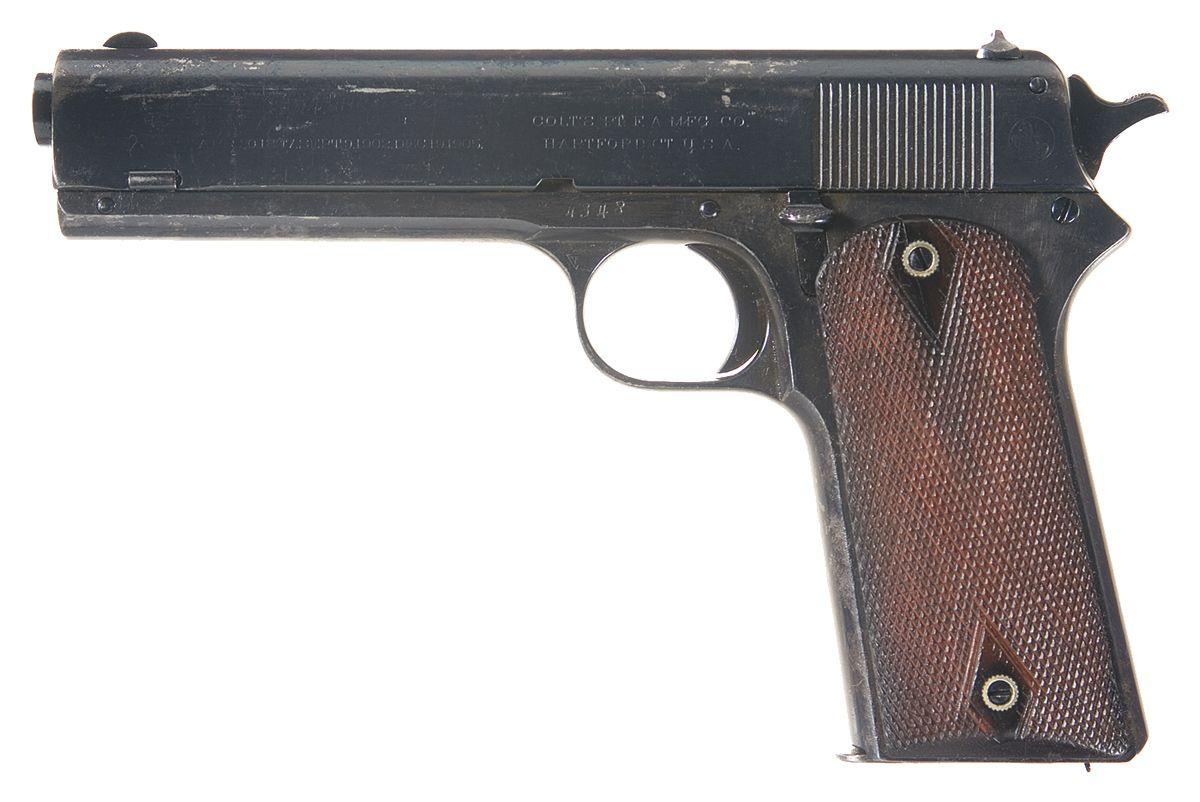 Manufactured in 1910 with standard markings and features. Complete with original magazine. Light scratches under serial number with light discoloration in the overall diamond checkering.