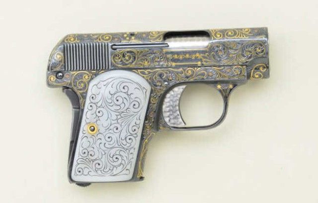Colt Model 1908 25ACP cal, pocket auto fully and finely scroll engraved with flush gold inlays surrounding the engraving and (gray ghost) colored composite grips which are engraved and inked to match. The pistol isalso accented with silver inlays which have tarnished to blue and blend with the background. The pistol is fully engraved even around the muzzle. The Colt has been high polished blued in a European Royal blue andthe Colt markings removed as to allow more surface for engraving. The trigger and breech end of barrel have been engine turned. The action is good, the bore is good, serial #78505. The engraving and inlay has a European influence similar to Browning engravers best work. A very pretty little gun, fine to excellent condition as refurbished at time of engraving. Est.;$2,000-$4,000.