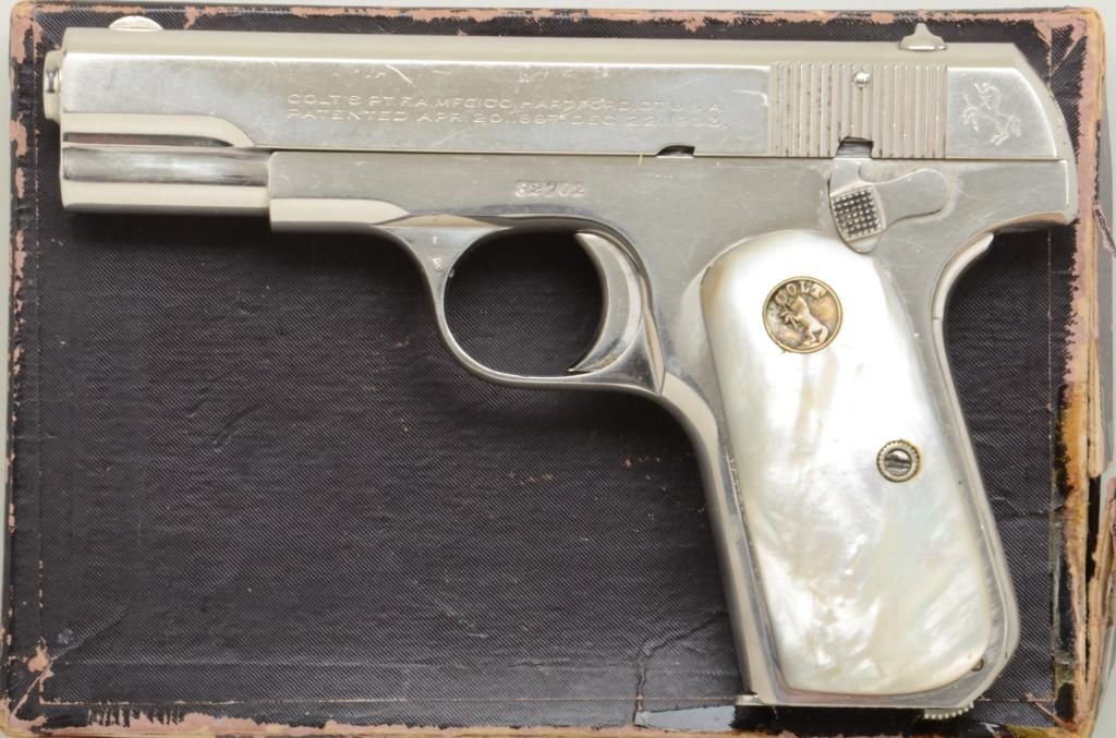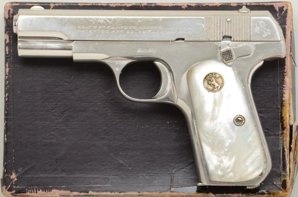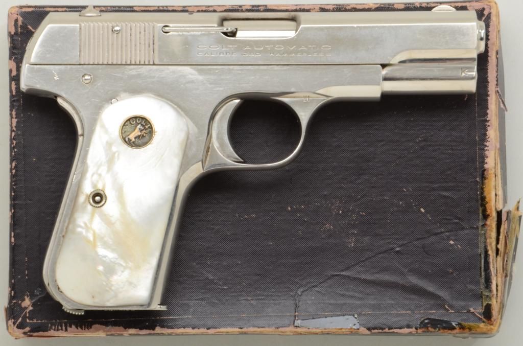 Colt Model 1908, .380 cal., pocket auto factory nickel finish, medallion pearl grips in original cardboard box, serial #82702. The pistol remains in near fine original condition, showing 97-99% original nickel,many small storage scratches in the finish, none of which are major. The grips are very good with normal aging, slight toning and correct medallions. The markings are sharp, the interior very good+. A correct markednickel clip is included; the nickel is in its natural state and not polished. The box shows correct end label, nickel sticker and serial #82046, probably a dealer switch as it is so close. The box is good to very goodwith some tatters and tears. Est.: $1,250-$2,500
