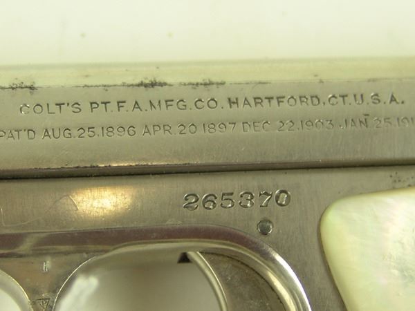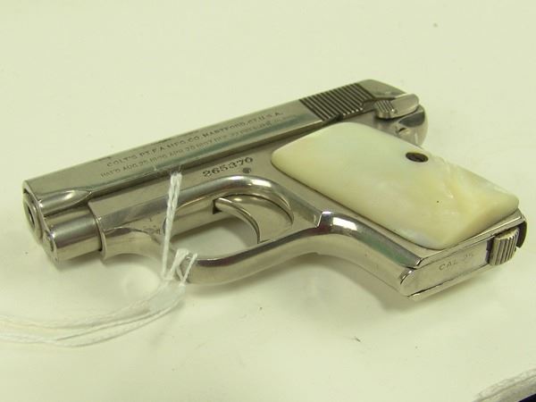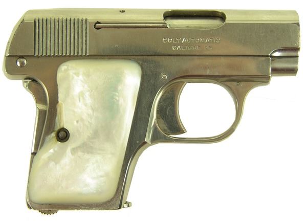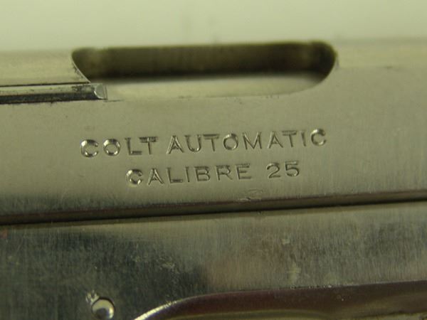 Colt's Factory "Model N", .25 ACP caliber pocket pistol with 2" barrel, period mother of pearl grips (one broken,) six-shot magazine,and Rampant Colt stamp, in rare, nickel plated finish. Very good condition.Early 1900s2" barrel