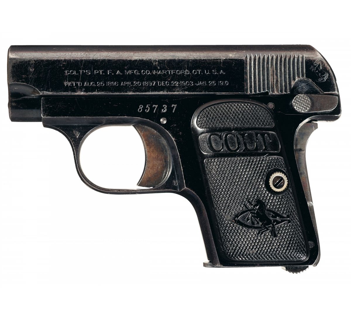 Manufactured in 1913. The left side of the slide has the two line address/patent dates marking with the Rampant Colt behind the serrations and the right side is marked "COLT AUTOMATIC/CALIBRE 25". The left side of the trigger guard bow is marked with the Colt "VP/triangle" proof and the number "5". Bright blue finish with casehardened grip safety, thumb safety and trigger. Complete with an original unmarked blue magazine and fitted with checkered hard rubber "COLT" banner and stylized C/Rampant Colt embossed grips.