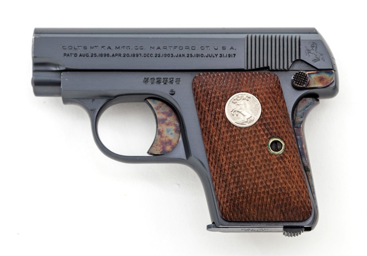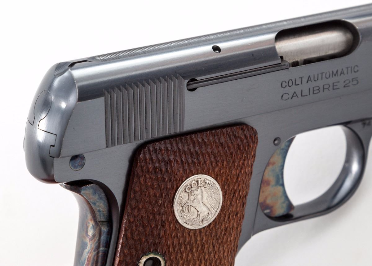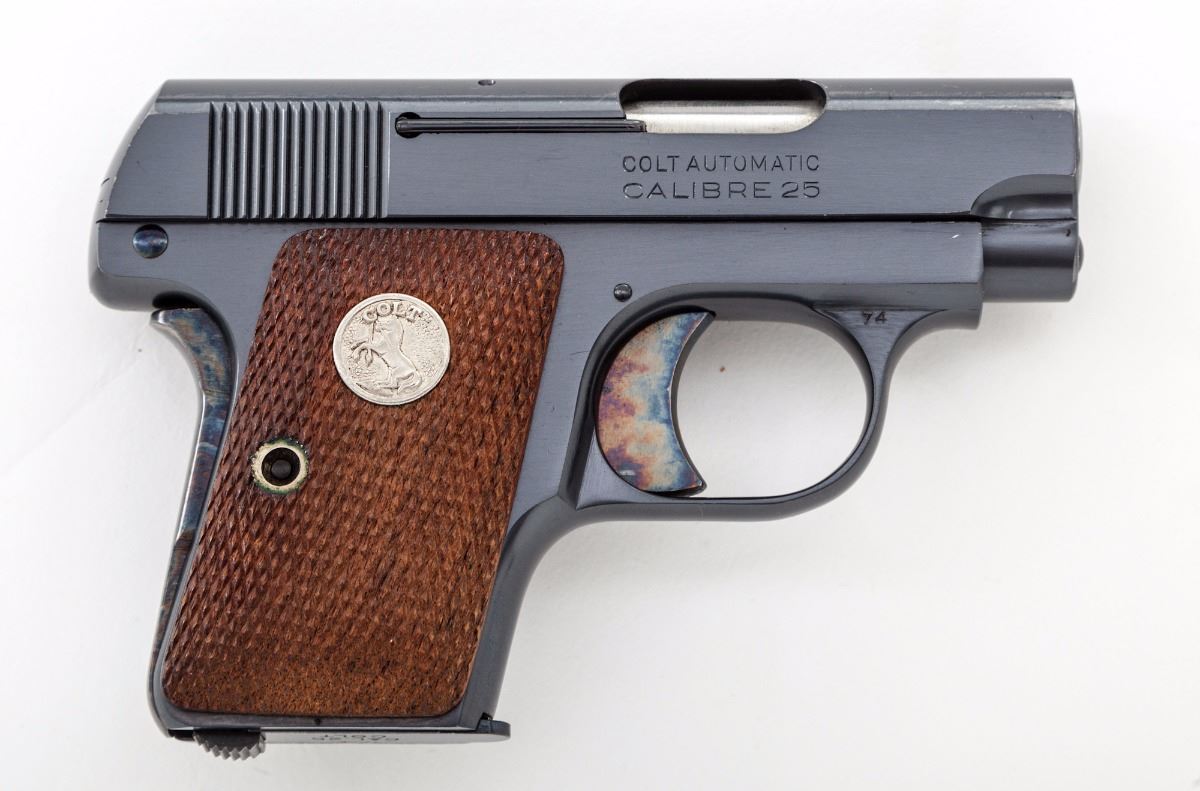 Colt Model 1908 Vest Pocket Semi-Automatic Pistol, #402328, .25 ACP cal., 2'' barrel, blue and case hardened finish, with factory checkered walnut grips, with flush medallions and one correct two tone magazine marked ''CAL .25/COLT''. Mfg'd 1935. Condition is excellent retaining approx. 99% original finish, with crisp grips and action and bright bore. Magazine is excellent as well. Tough to improve upon. Est.: $750-$1,000. (C&R/PPT).
