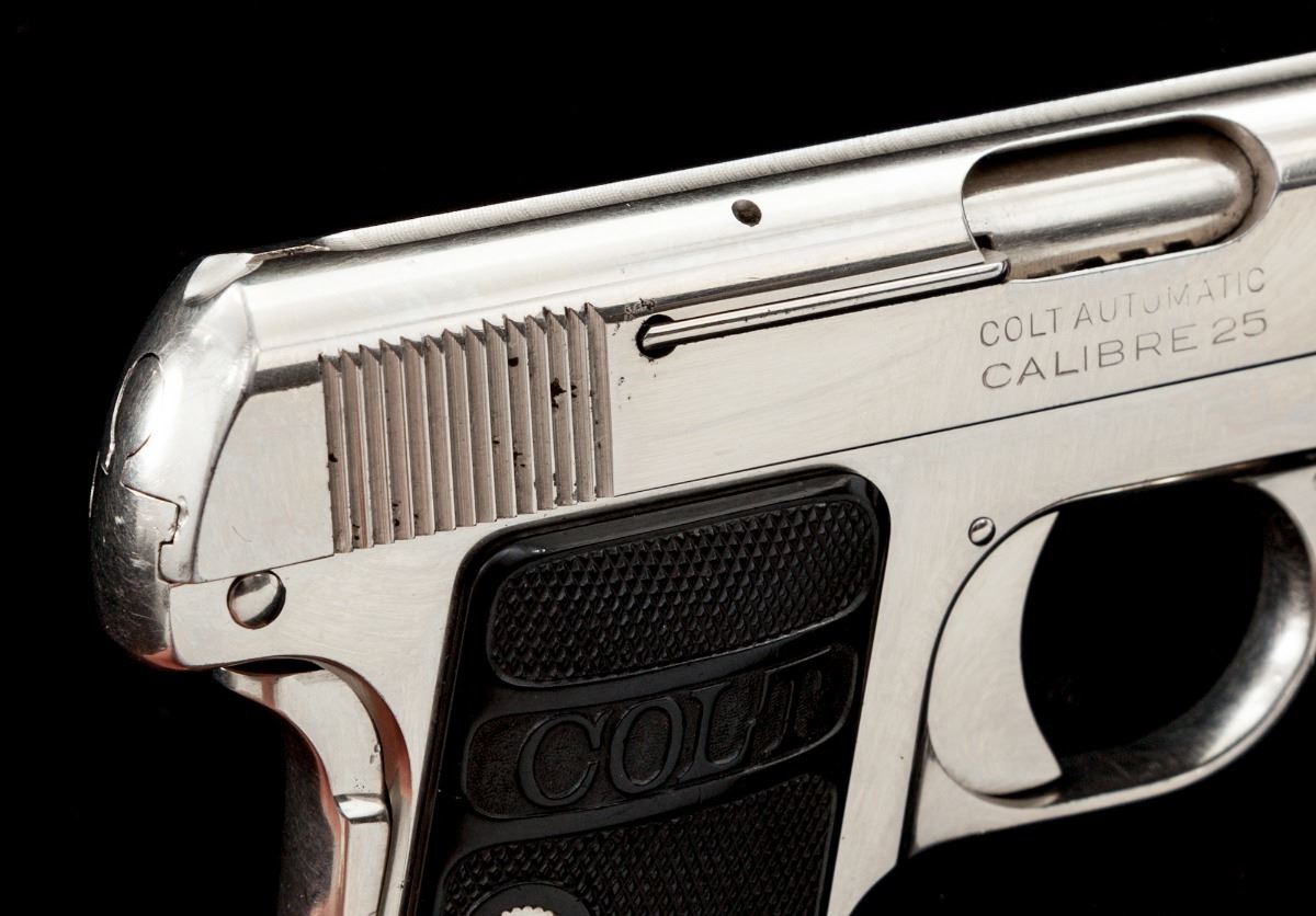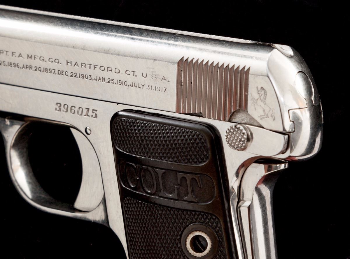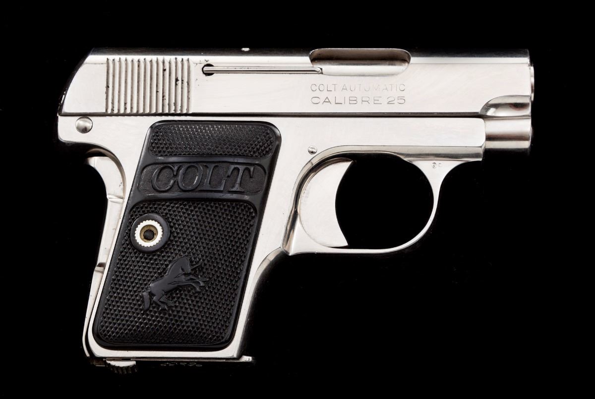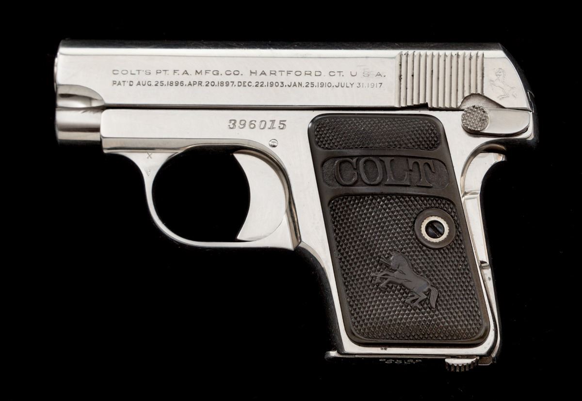 Colt Model 1908 Vest Pocket Semi Automatic Pistol, #396015, .25 ACP cal., 2'' barrel, nickel finish, factory checkered hard rubber grips, with one nickel magazine marked ''CAL .25/COLT''. Mfg'd 1933. Condition is near excellent retaining approx. 98% factory nickel finish with no real losses, just light general thinning with overall micro-scratching. Grips exhibit mild flattening with a good action and bright bore. Est.: $600-$800. (C&R/PPT)