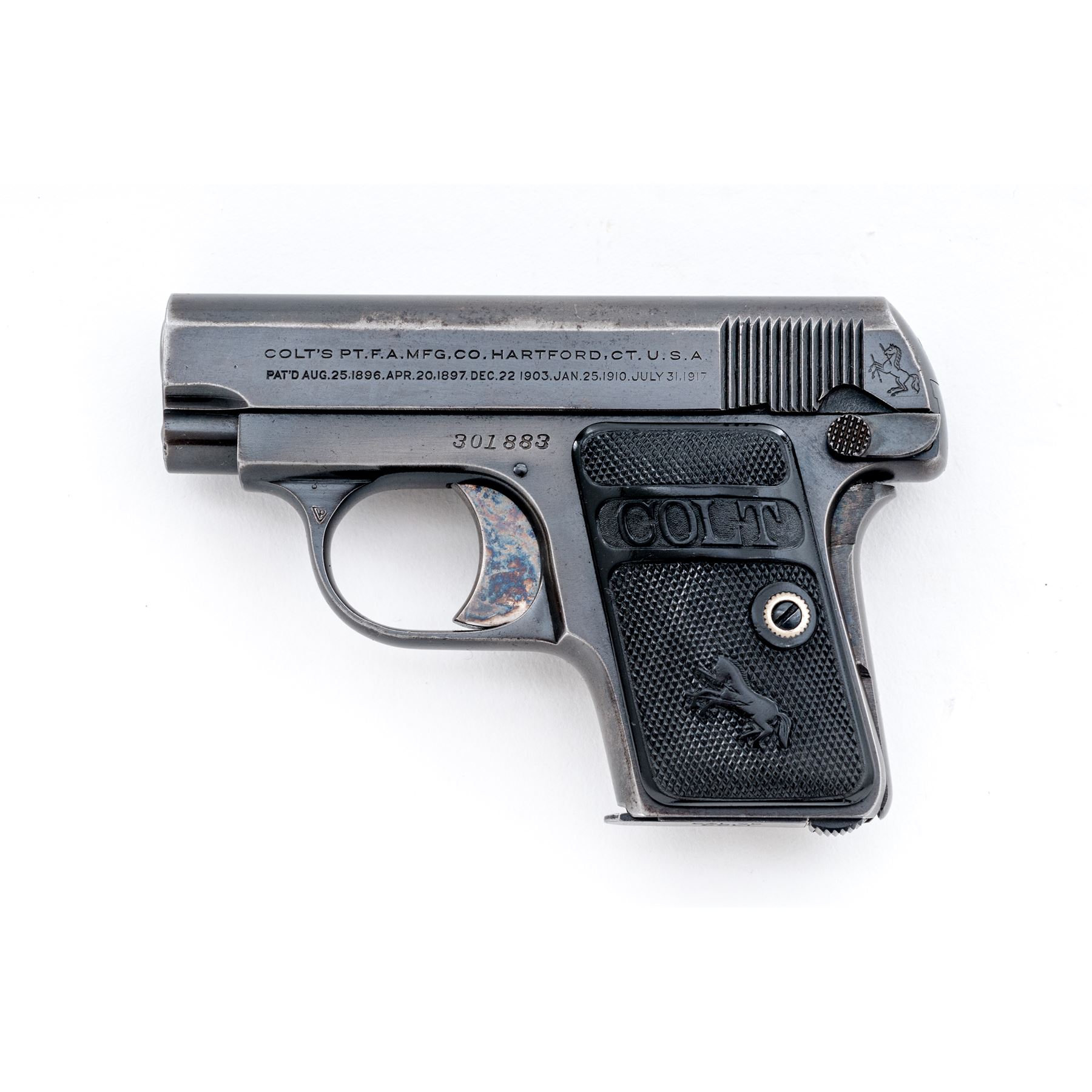 Colt Model 1908 Vest Pocket Semi-Automatic Pistol, #301883, .25 Auto cal., 2'' barrel, blue finish, case colored small parts, checkered hard rubber grips, with one Colt magazine. Mfg'd 1921. Condition is fine retaining approx. 90% thinning and toning factory blue. Grips with minor smoothing. Good action and bore. Est.: $250-$450 (C&R/PPT)