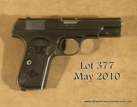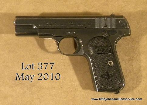 Colt Model 1908 semi-auto pistol, .380 cal., 4” barrel, blue finish, checkered Colt black hard rubber grips, #42018. This gun is in overall very good condition showing approx. 90% original muted blue finish, good bore, sharp markings, goodaction and grips, no magazine. Est.: $200-$400.