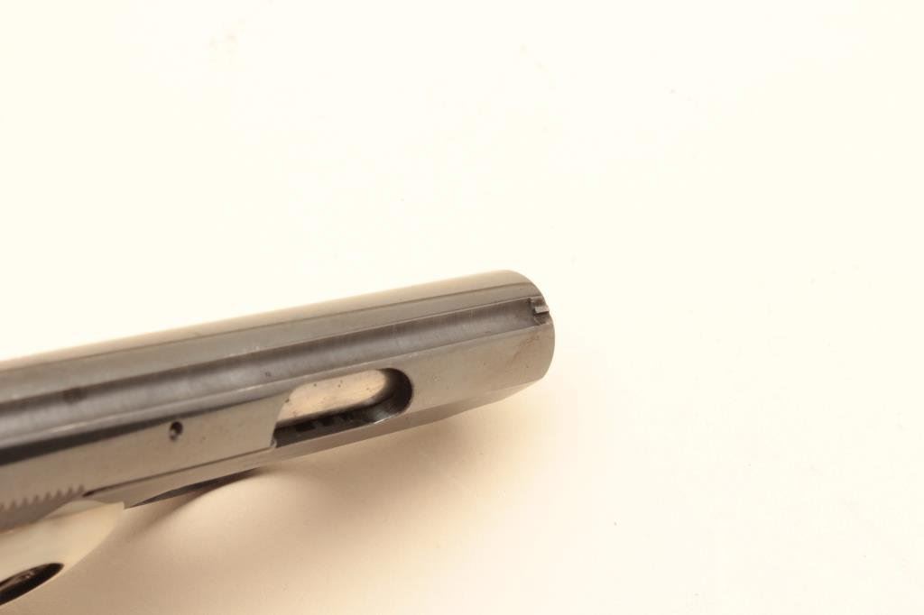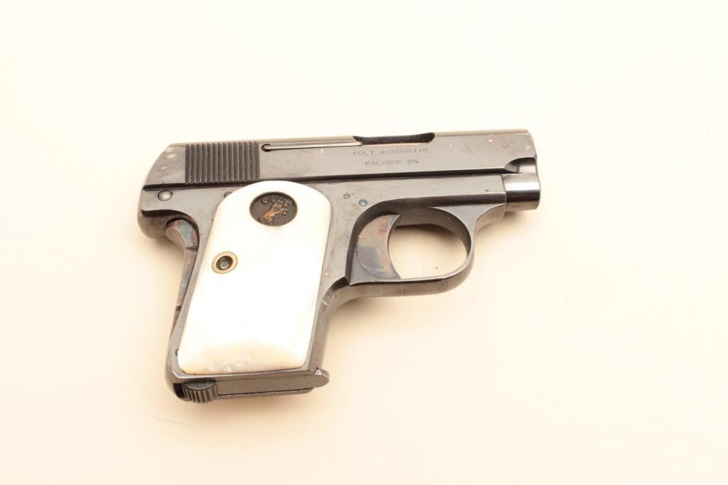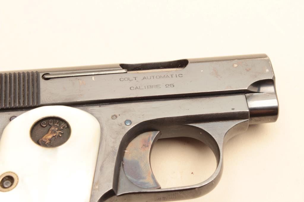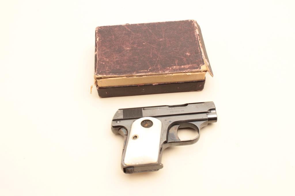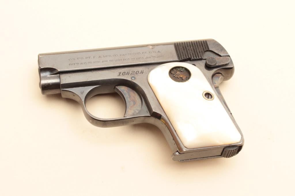 polish blued finish, thick pearl Colt medallion grips, two tone magazine, S/N 104204, in overall fine to excellent condition showing majority of original finish, fine bore, crisp action, sharp markings and fine iridescent pearl grips; accompanied by a factory cardboard box with correct end labels and instructions sheet. (C&R/PPT). Est.: $600-$1,200.