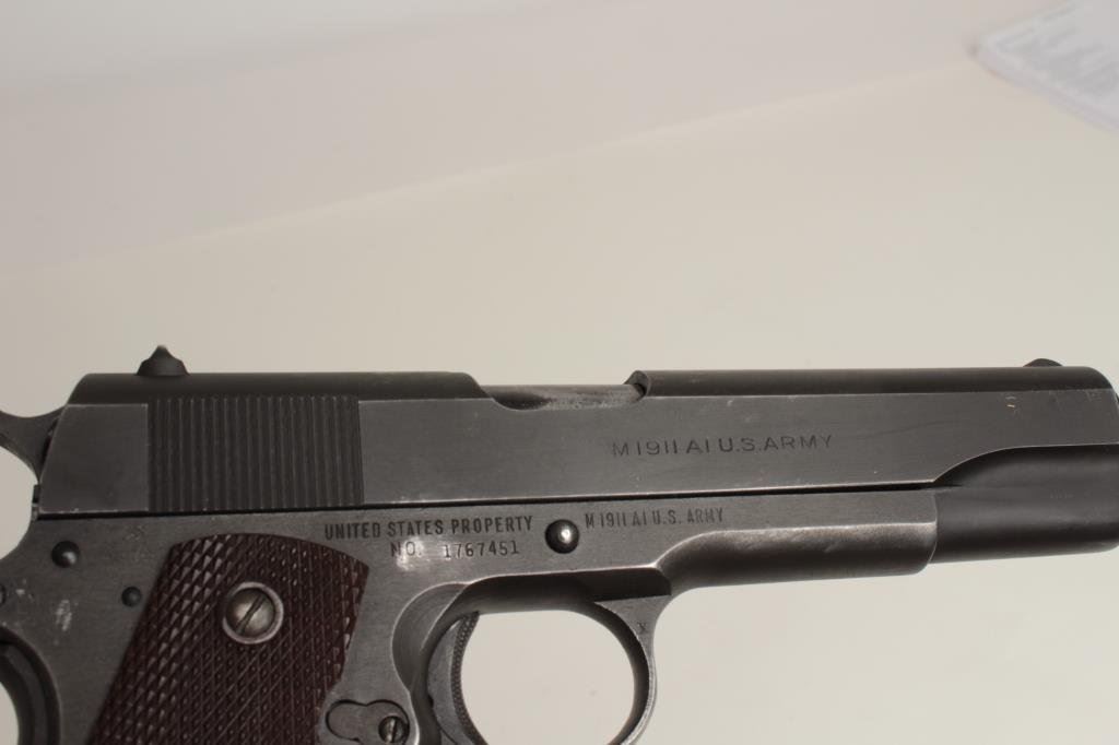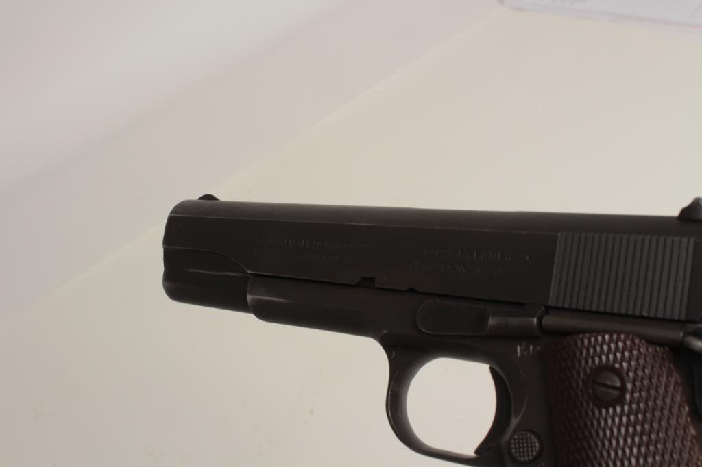 caliber, 5” barrel, “FJA” inspected, mat black finish, checkered brown plastic grips, S/N 1767451, in overall very good condition showing the majority of finish, some high point wear, very good to fine bore, crisp action and sharp markings, fine grips, commercial magazine. Accompanied by a US leather flap holster. (C&R/PPT). Est.: $1,400-$2,800.
