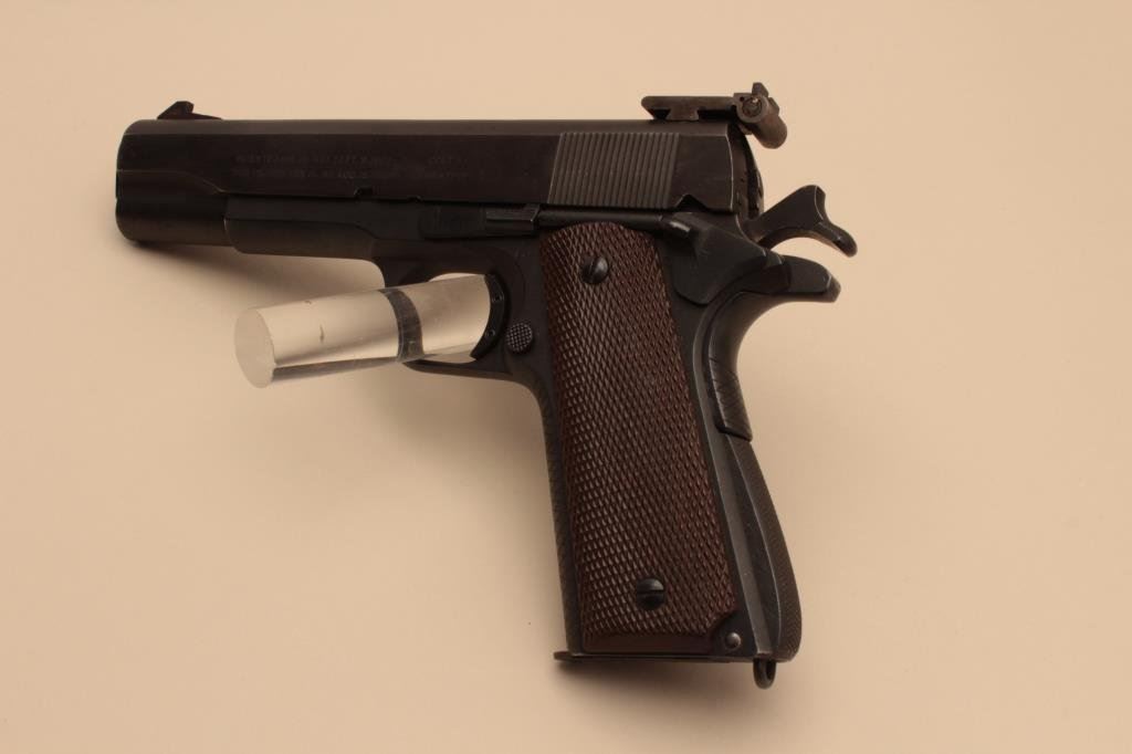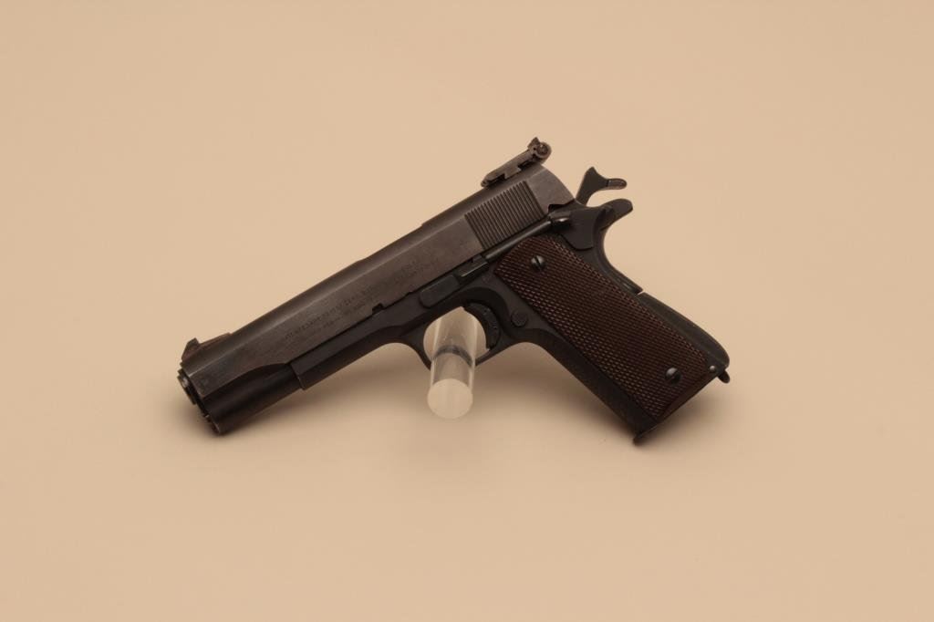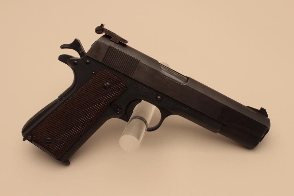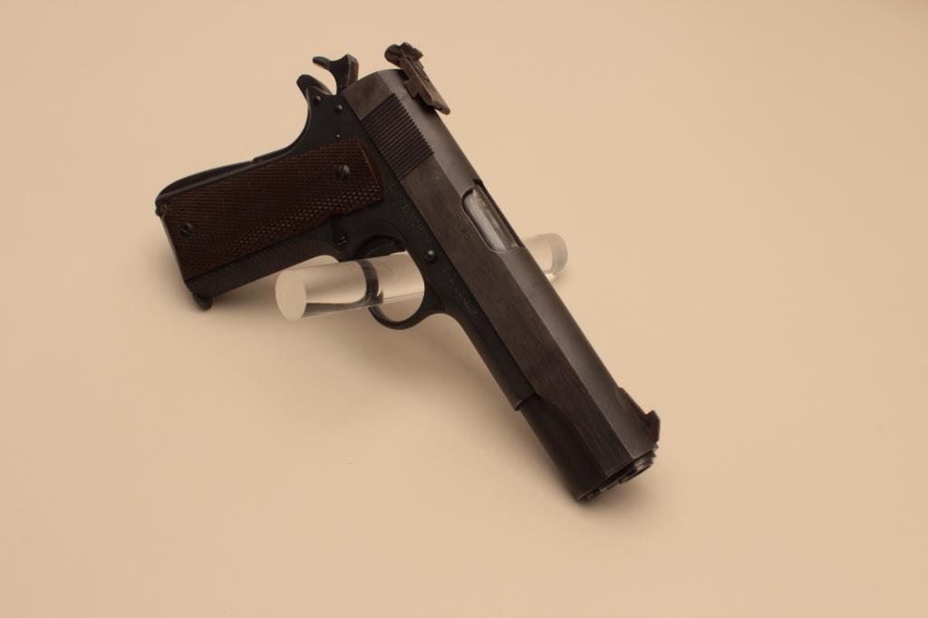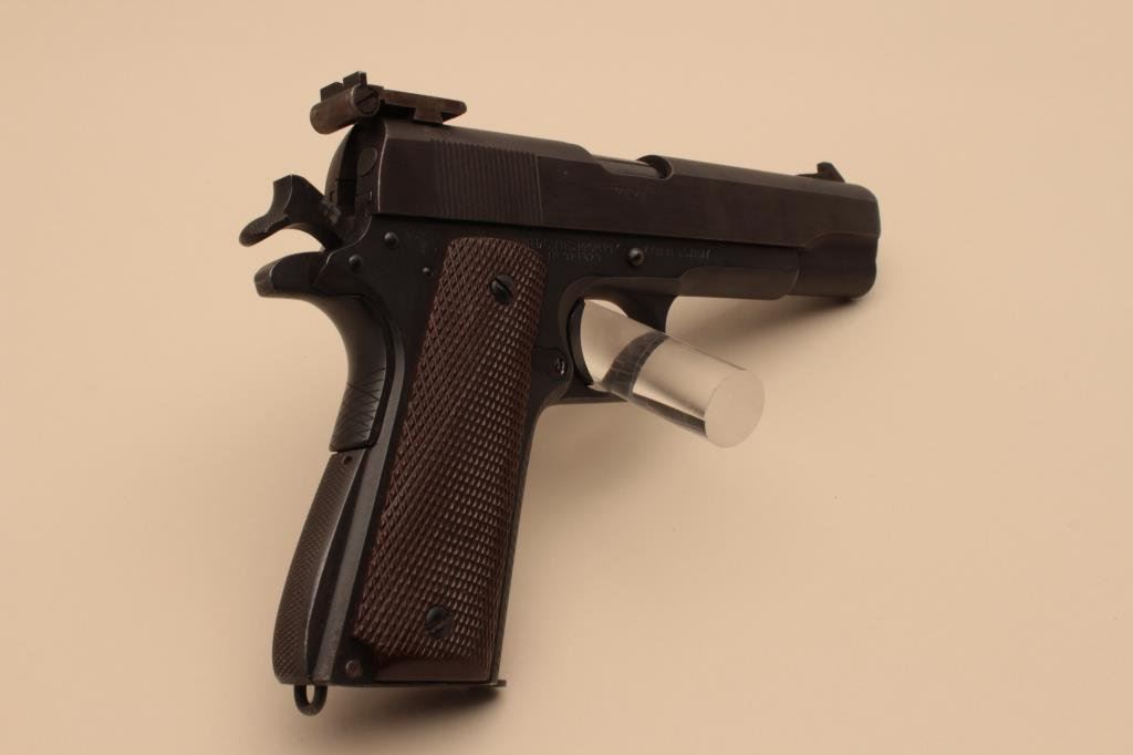caliber, 5” barrel, mat black finish, checkered brown grips, Elliason adjustable rear sight, S/N 921829 with “0893” stamped on right side of slide below ejection port, added trigger shoe; in overall good to very good condition displaying the majority of its finish, hand checkered front grip strap and rear grip safety; very good bore, good markings and fine grips; action is not working and in need of attention by a competent gunsmith. (C&R/PPT). Est.: $1,400-$2,800.