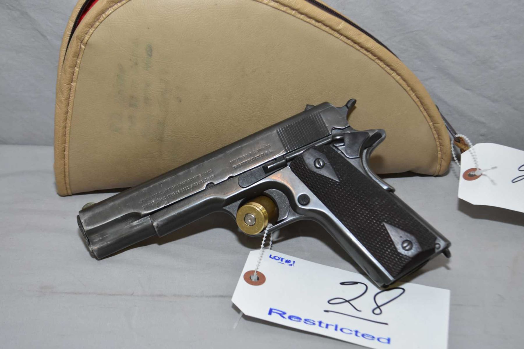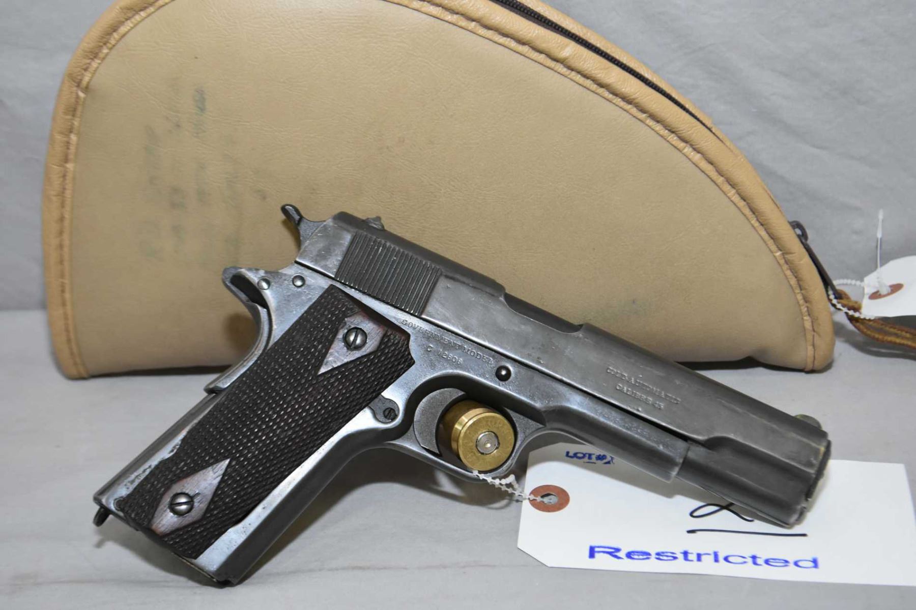 Colt Model 1911 Government .45 Auto Cal 7 Shot Semi Auto Pistol w/ 127 mm bbl [ faded war finish, checkered wooden grips Note : right side is chipped, some marks, c/w soft pistol case ] Ser # C12808 Restricted Handgun Cert # Old Cert # K - 633563 FRT # 18047 - 2