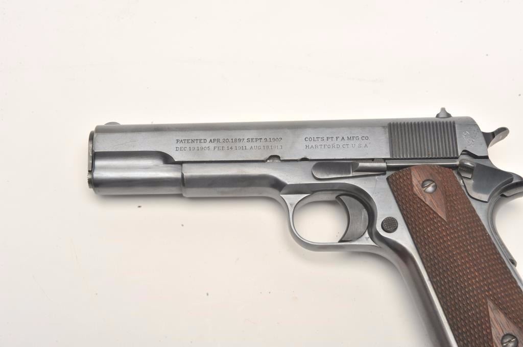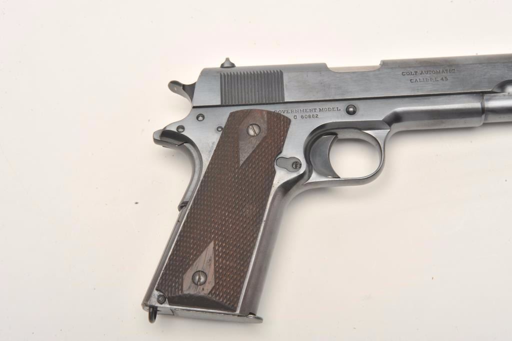 Colt Model 1911 Government Model semi-automatic pistol, .45 caliber, 5” barrel, blued finish, checkered wood grips, S/N C60882, in overall fine condition with approximately 98% + original finish, finebore, crisp action and markings and fine grips. (C&R/PPT). Est.: $2,000-$4,000.