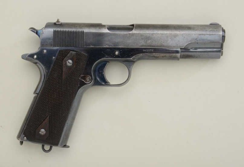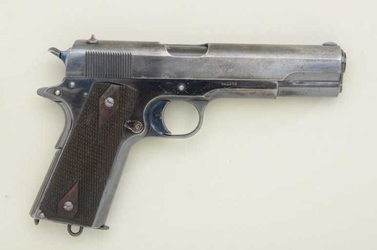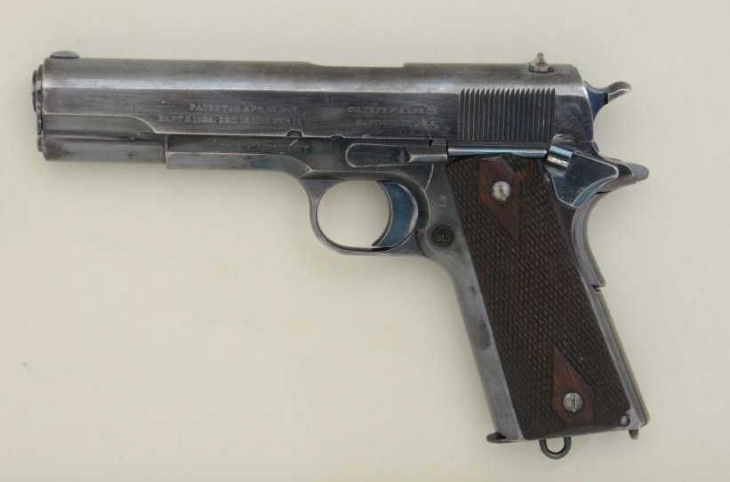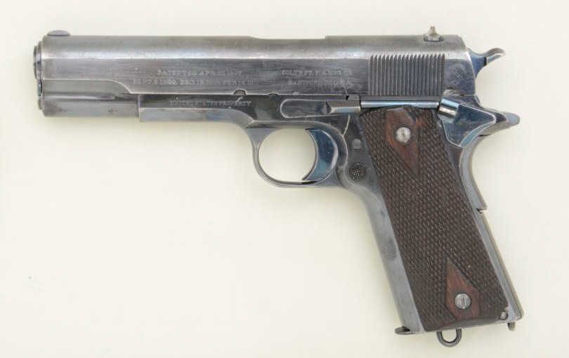 Colt Model 1911 U.S. Property marked, .45 ACP cal., high polish commercial quality blue finish, diamond checkered wood grips, serial #1176, shipped to Commanding Officer, Springfield Armory, March 2, 1912 in ashipment of 200 pistols, serial #1001 through #1200; with letter confirming early features including 1897 patent date on slide, forward serial number on right side of frame, early U.S. property markings, fire blue smallparts, rounded rear sight and other early variations. The letter on "Gun Report" stationery is signed by editor and Colt auto expert Scott Meadows. The pistol shows 50-70% original blue finish with some eventoning and aging, light beginning erosion, and losses at the high points and operating areas. The markings are sharp and crisp; there are a few scratches and the metal condition is pleasing. The grips are verygood with minor staining and aging; the lanyard bottom clip is original but of slightly later production. The action good, the bore bright, and all correct small parts. It would be difficult and expensive to