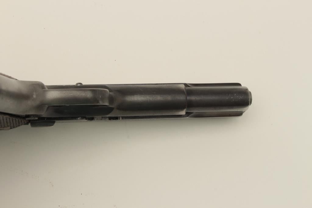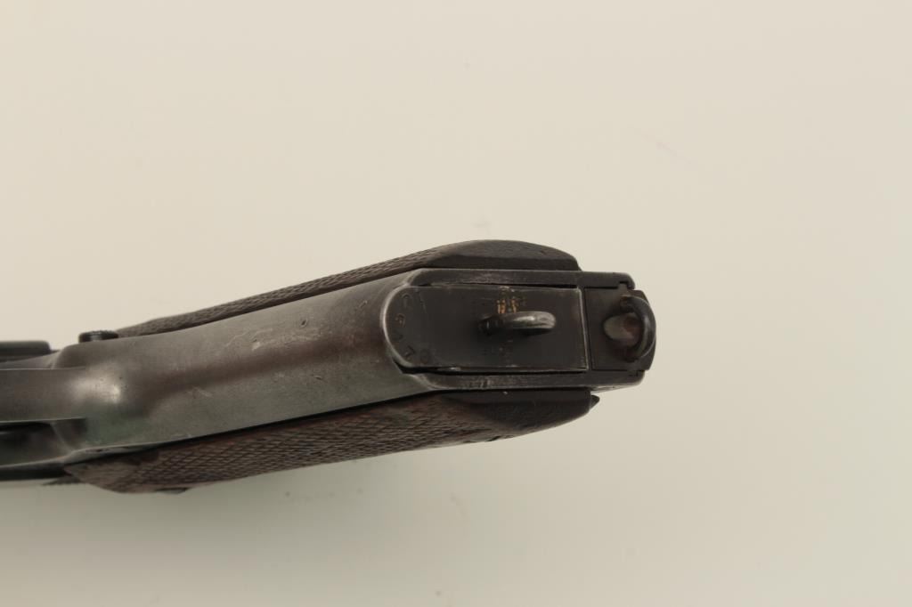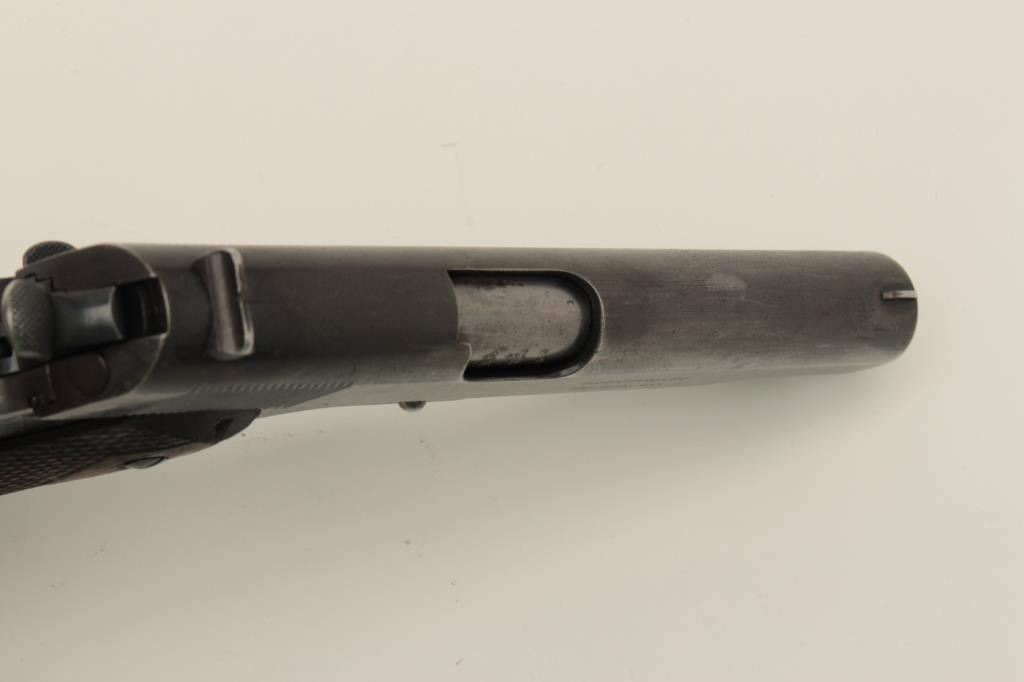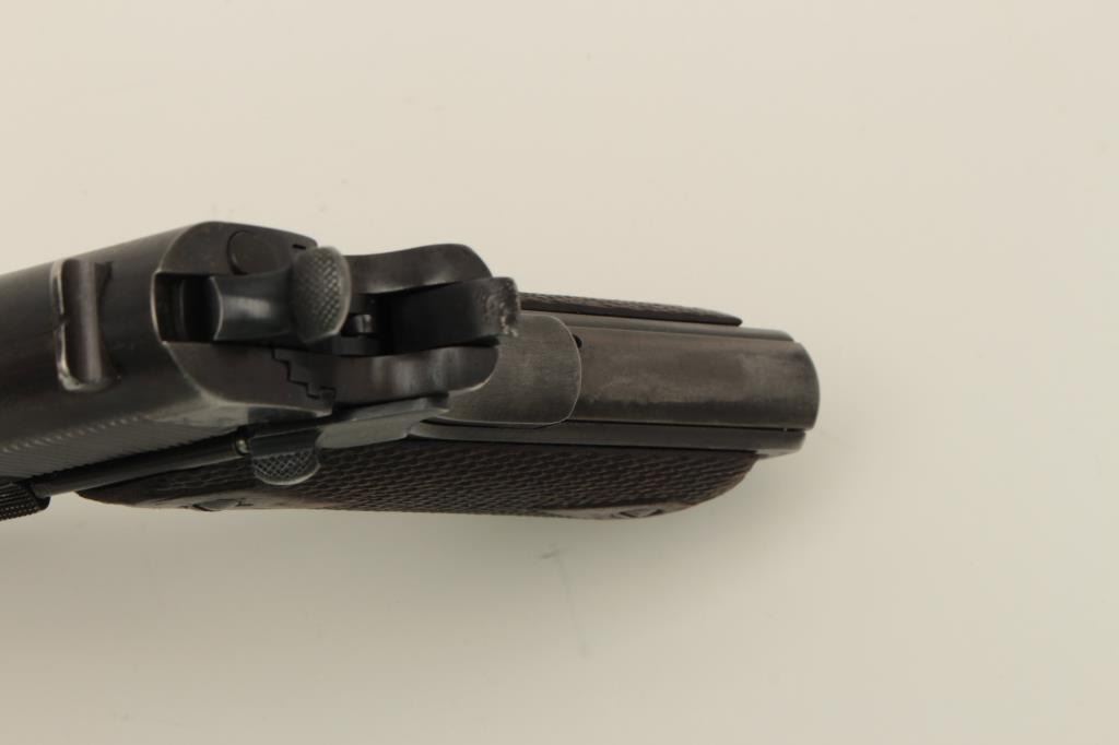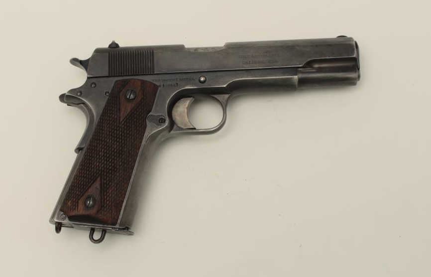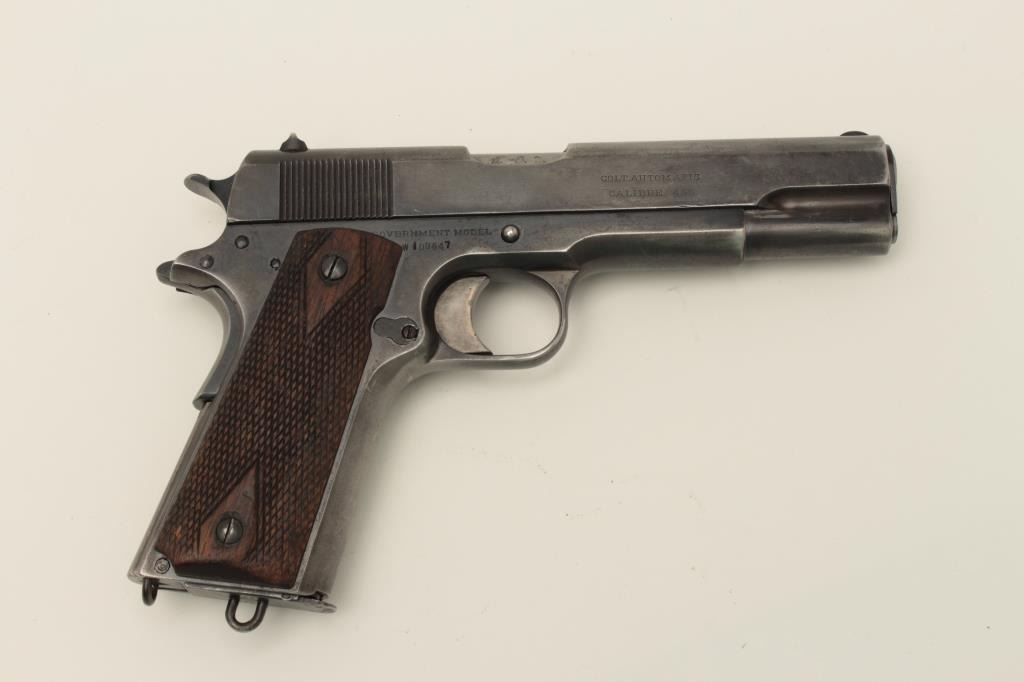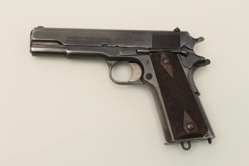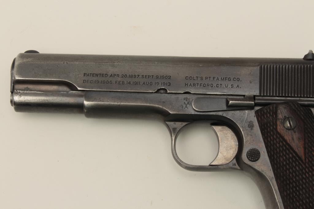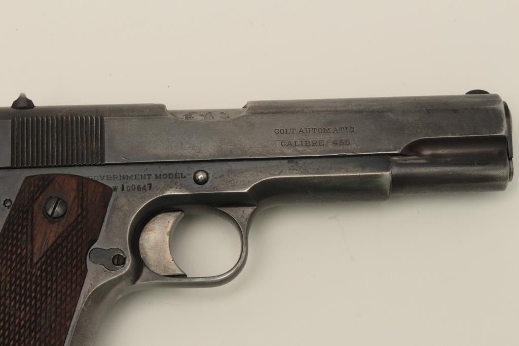 Colt Model 1911 semi-automatic pistol, in scarce .455 caliber, British War Dept. marked and British proofed, S/N 10647; caliber .455 Eley marked clip numbered to gun; 75%to 85% original blue, grips good with slight wear,good markings, bore good with slight pitting. (C&R). Est.: $3,000-$6,000.