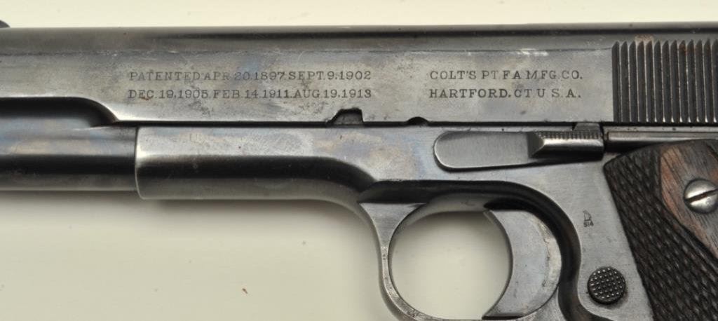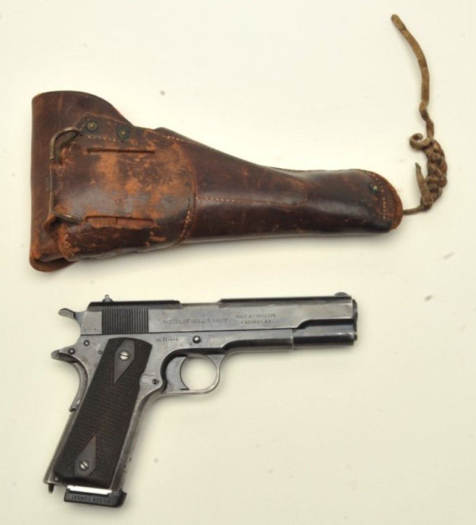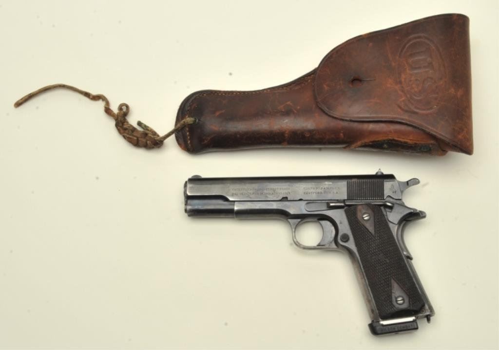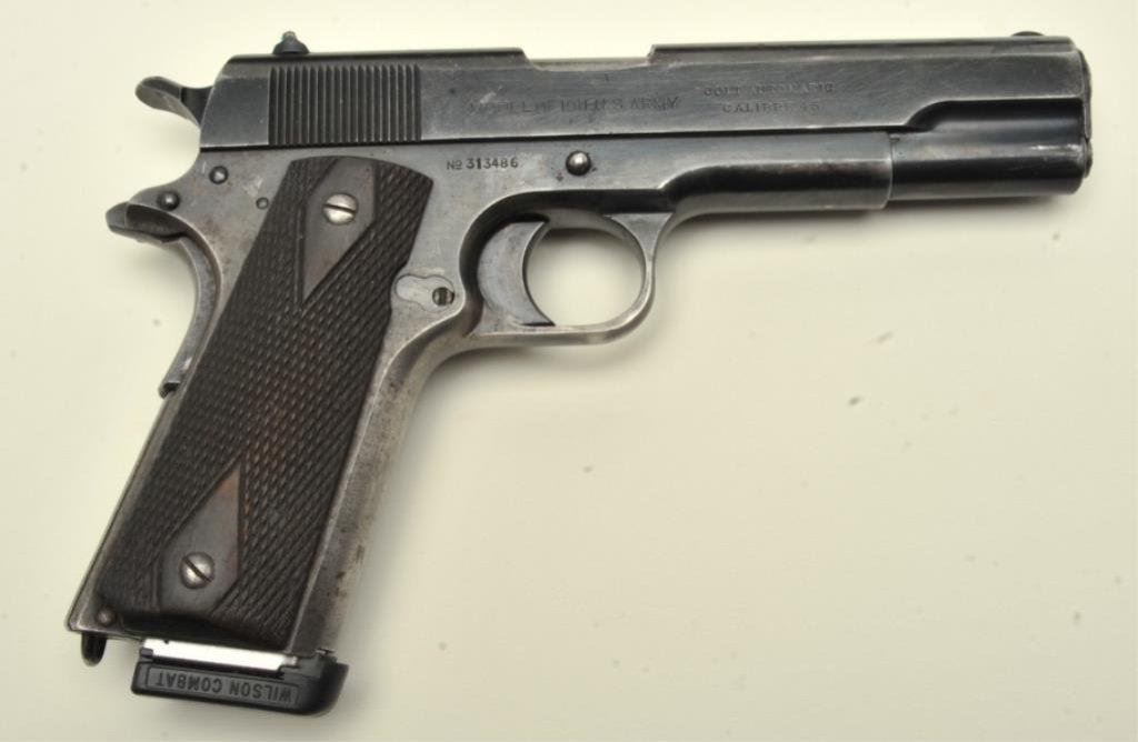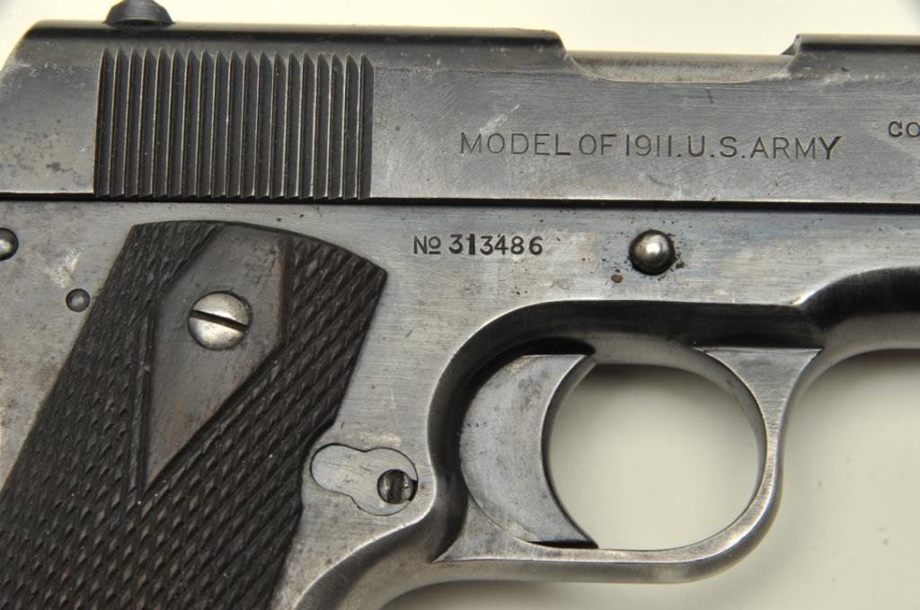 marks on frame but marked on right side of slide “MODEL OF 1911 U.S. ARMY”, S/N 313486, crisp action, sharp markings and some cold blue applied; good overall with Wilson replacement magazine. Accompanied by a U.S. leather flap holster. (C&R). Est.: $800-$1,600.