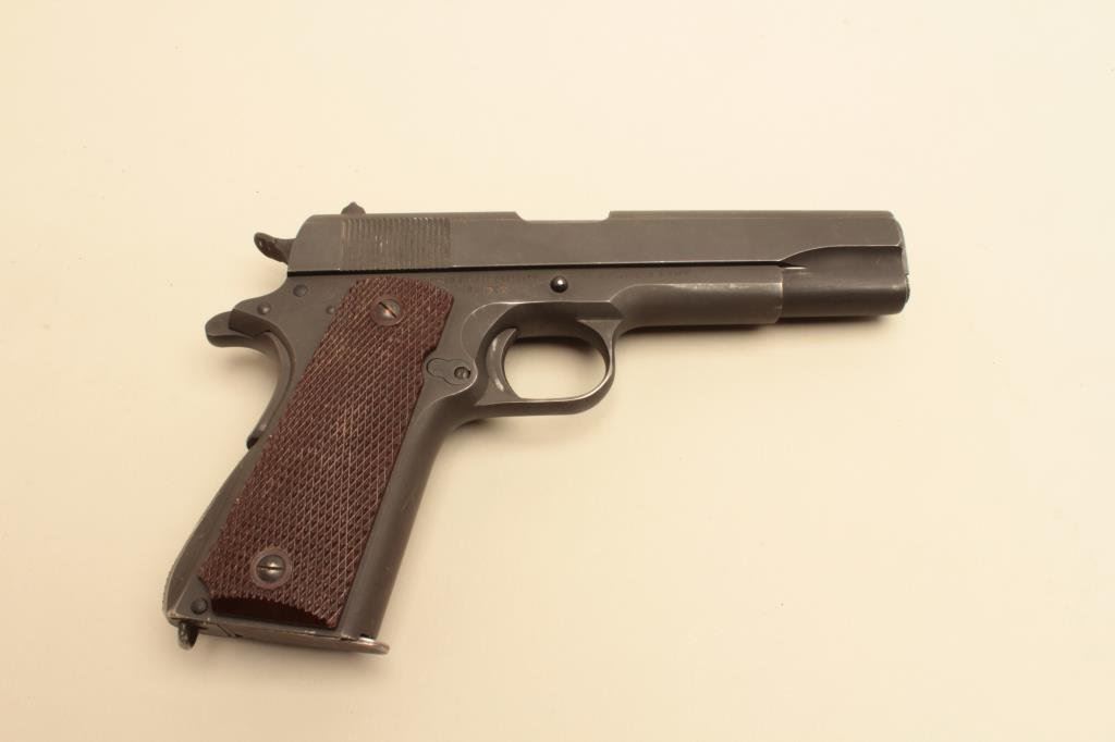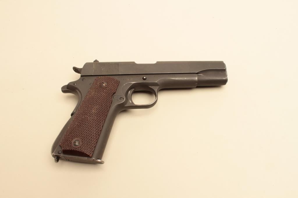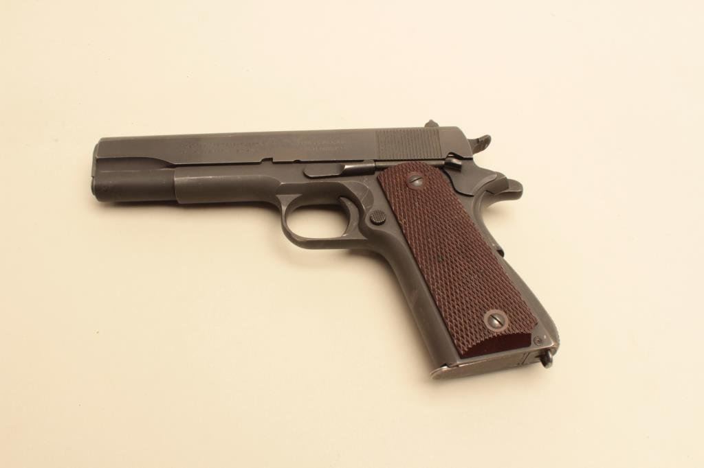 884707. This Colt shows 90%-95% arsenal finish with pronounced heat treat line on the slide. “G.H.D.” and “P” proofs. Near fine grips and sharp markings. Fine bore. “CR” marked military clip. A strong 9 for a WWII Colt. (C&R/PPT). Est.; $1200-$2400