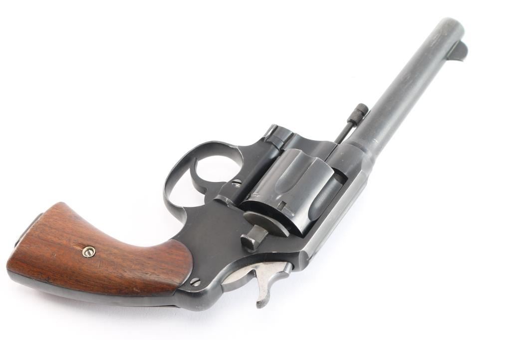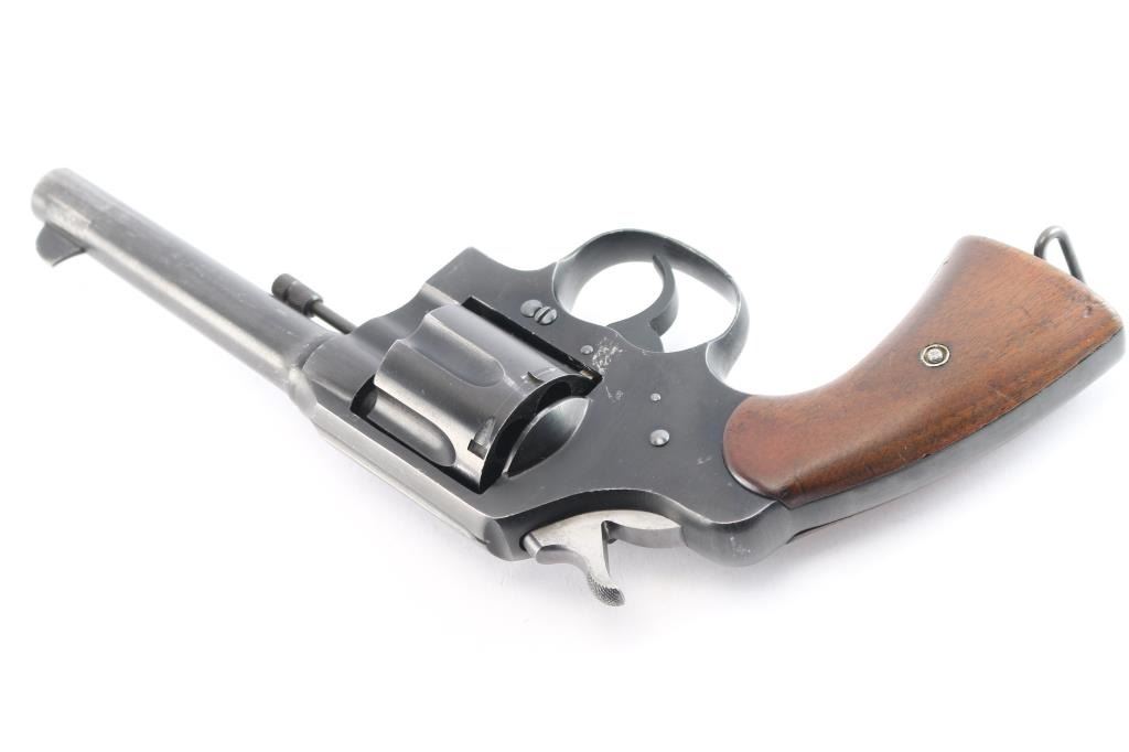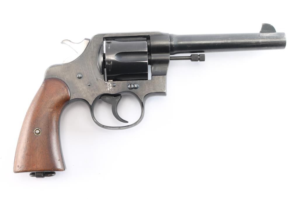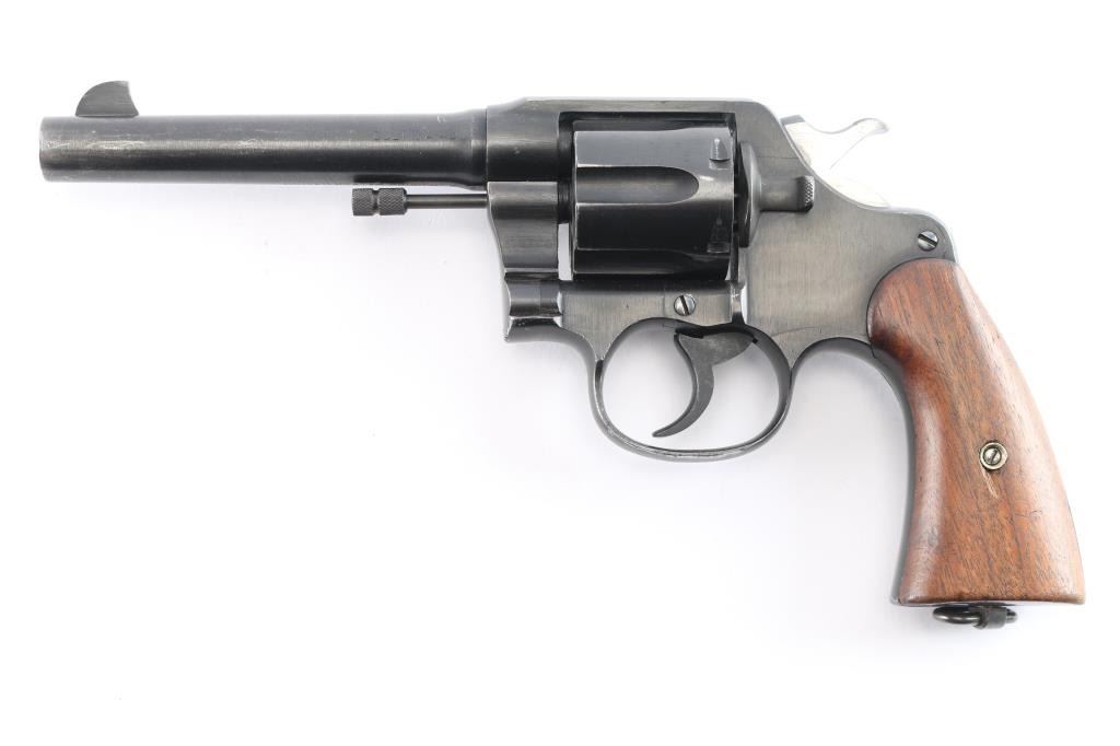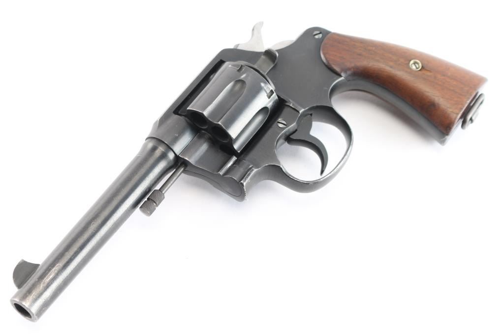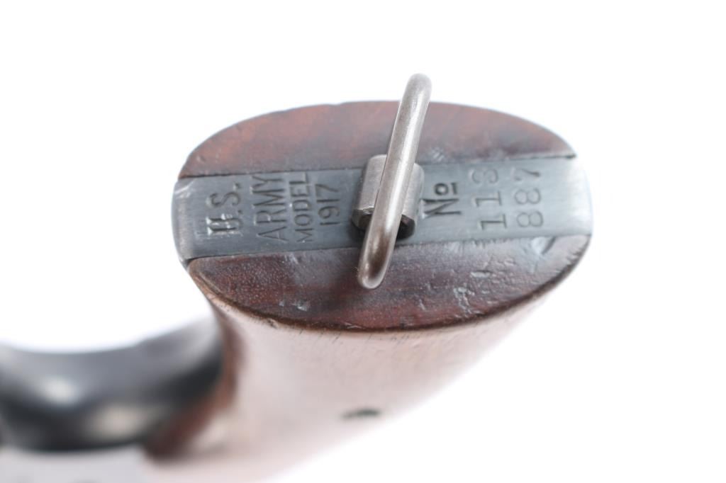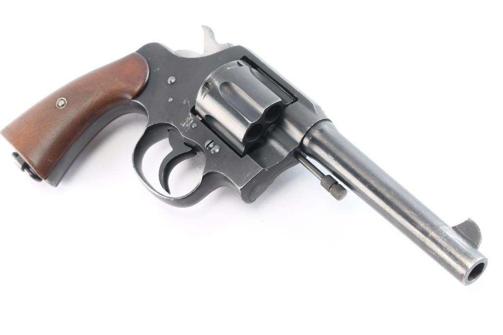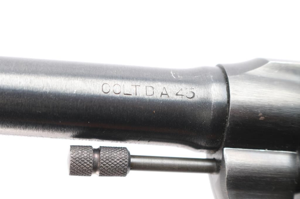 Vintage U.S. military large frame double-action service revolver chambered in .45 Automatic Colt Pistol, manufactured in Hartford, CT circa 1920. Revolver features a re-blued finish, 5.5" round tapered barrel, blade front sight, "U" notched frame rear sight, fluted six-shot cylinder, checkered cylinder release, non-shrouded ejector rod, knurled ejector rod head, blued smooth curved trigger, firing pin on hammer nose, in-the-white hammer, checkered hammer spur, smooth grip straps, lanyard ring on the grip butt, and correct smooth wood grips. Frame is marked “S/18" under eagle head, and “U.S./ARMY/MODEL/1917" & "No 113887" on the butt. Barrel is marked "UNITED STATES PROPERTY", "COLT'S PT FA. MFG. CO. HARTFORD CT U.S.A./PATD AUG 5.1884 JUNE 5 1900 JULY 4 1905," and a faint "COLT D.A. 45". Matching serial numbers '11438' on barrel, yolk, and frame. Revolver retains approximately 90% of its refinished bluing edge wear, some heavier nicks on the right side of the frame under the cyliner, and light scattered scratches. Metal displays no rust or deformation, nut the engravings are shallow, and not sharp from refinishing. Action is smooth and crisp with a tight lock-up. The bore appears frosty with strong rifling. Wood grips are very good with normal handling marks, and a chip by the left grip panel's screw escutcheon.
