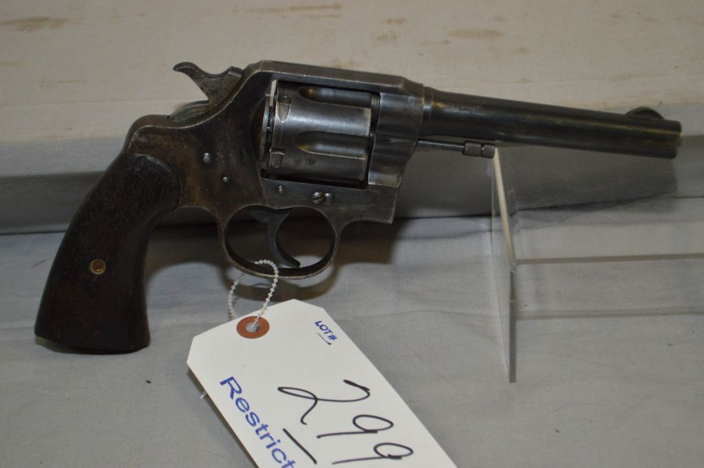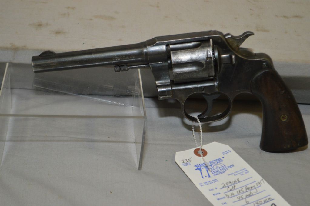 Colt Model 1917 US Army ( DA 45 ) . 45 Auto Cal 6 Shot Revolver w/ 140 mm bbl [ blued finish starting to fade, slight cylinder ring, barrel marked Colt DA 45 United States Property, butt marked U.S. Army Model 1917 No. 147307, lanyard stud ground flat, worn and chipped grips ] Ser # 299068 Restricted Handgun Cert # 5893425