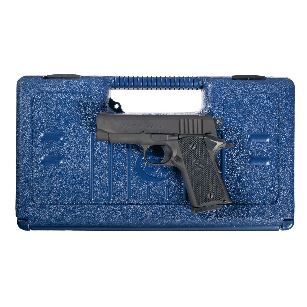 Manufactured in 1997 when the fixed white dot sights were available. Features a combat hammer, smooth trigger, six round magazine with extension, and checkered black Rampant Colt grips. Complete with blue plastic case numbered to gun with an extra magazine.