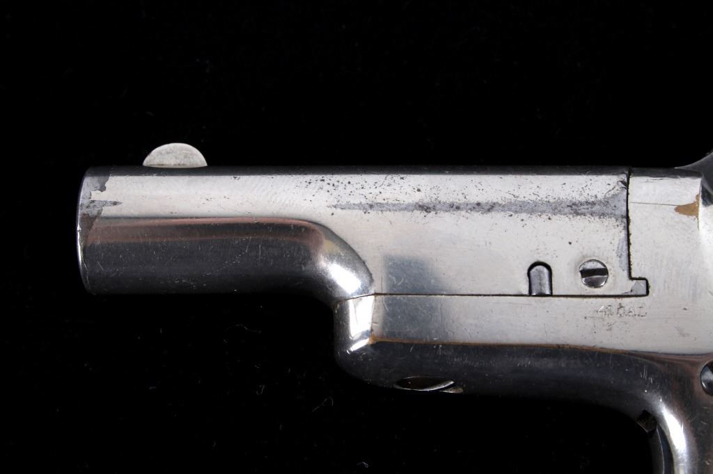 For your consideration is a Colt model 3 single shot derringer pistol. This single shot pistol is chambered in .41 RF. The 2 1/2" barrel is marked on the top, reading "Colt". The firearm utilizes a fixed blade front sight, spur trigger, and checkered hammer. The frame shows wonderful walnut wood grips with brass construction and nickel plating. The pistol shows good condition for its age overall, with light wear due to use. Serial Number: 1489. This firearm qualifies as an Antique and does NOT require an FFL transfer or NICS background.