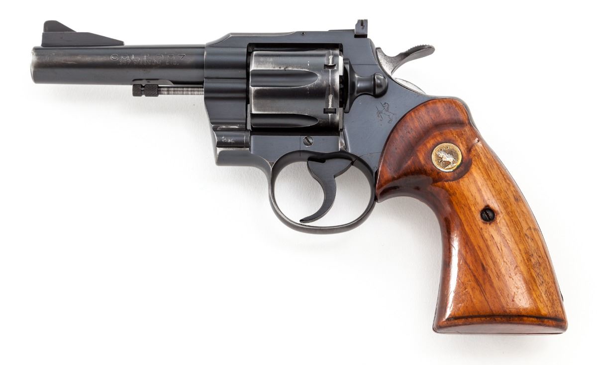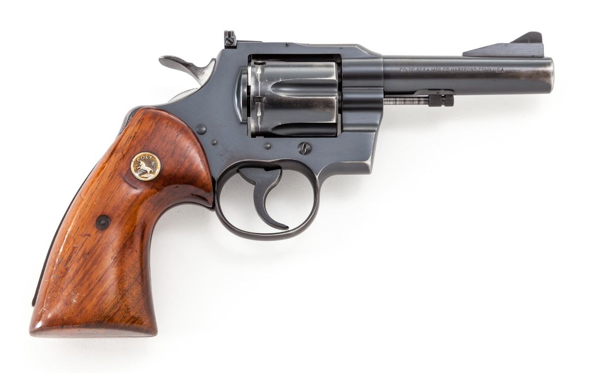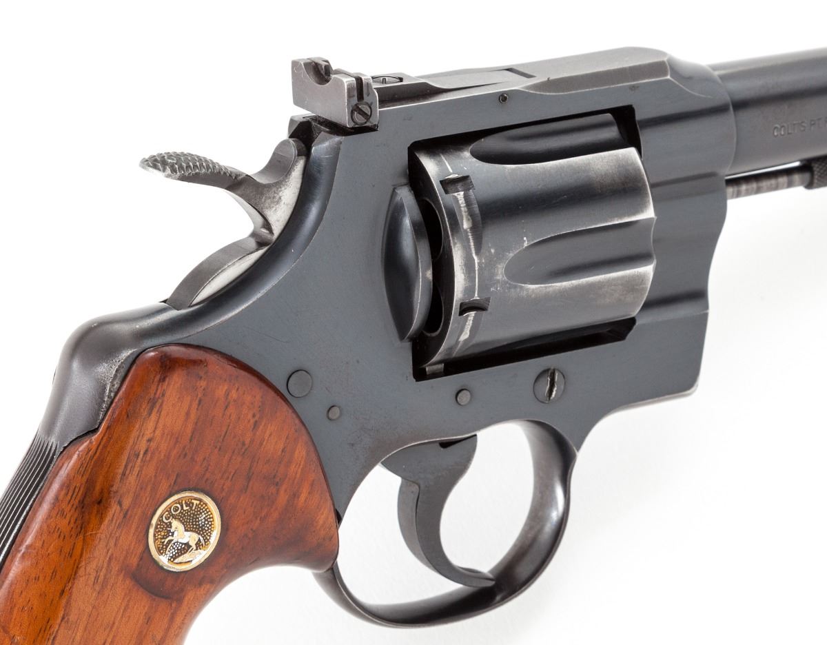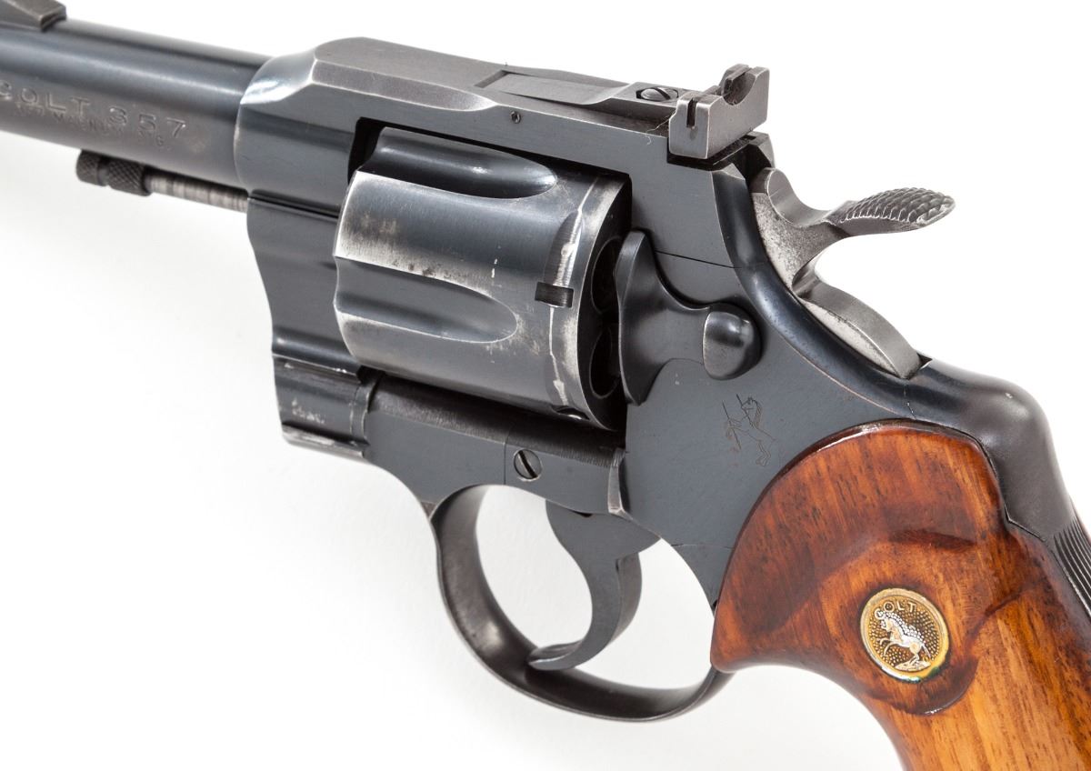 Colt Model 357 Double Action Revolver, #23173, .357 mag. cal., 4'' barrel, blue finish, factory target walnut grips with Colt medallions, and factory adjustable rear sight. Mfg'd between 1953-1961. Condition is fine retaining approx. 90% blue with general thinning overall. Grips have been modified with sanding to remove checkers and a coat of varnish. Action is good, bore is bright. Est.: $450-$600. (C&R)