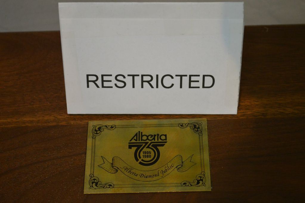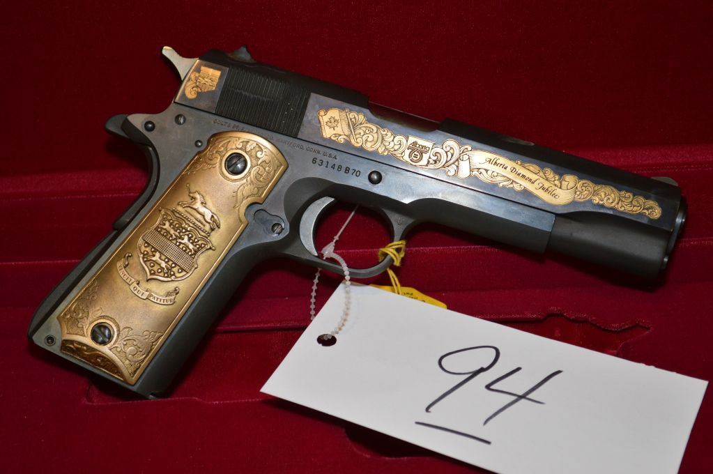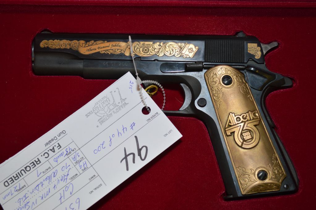 Colt Model Alberta Diamond Jubilee Commemorative 75 Th Anniversary 1905 - 1980 .45 Auto cal 7 Shot Semi Auto Pistol w/ 127 mm bbl [ Limited Edition # 44 / 200 , Very Rare, appears as new unfired in Presentation case , blue finish, engraved with gold highlights, gold pewter grips w/gold etching on side, has Colt Coat of Arms motif on right side, Logo, & 1905 - 1980 on left side ] Ser # 63148B70 Restricted Handgun Cert # 18281969