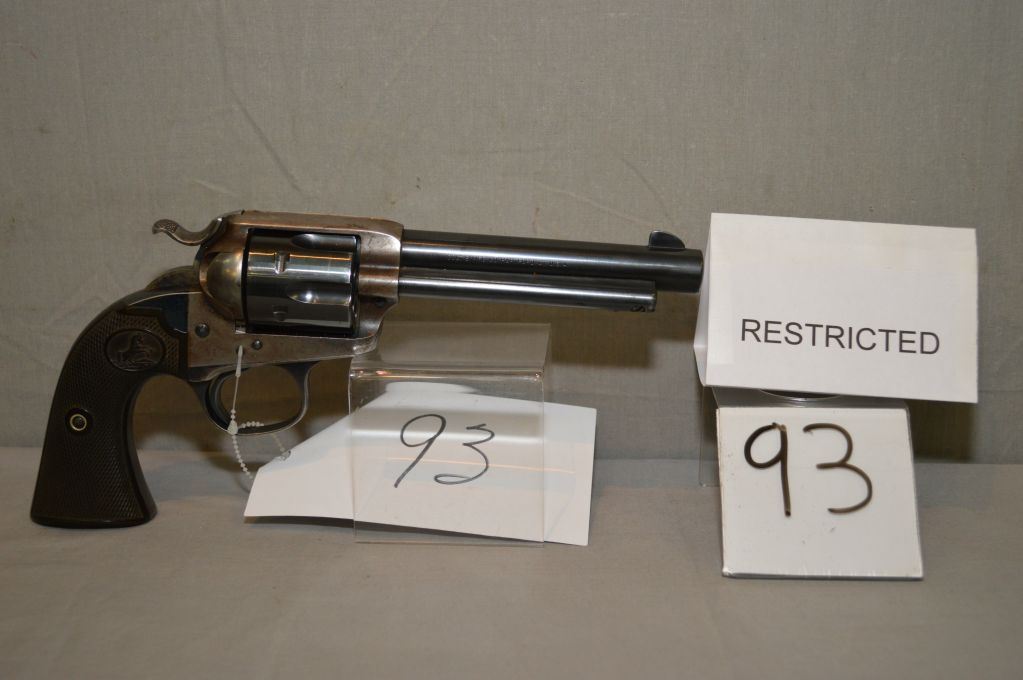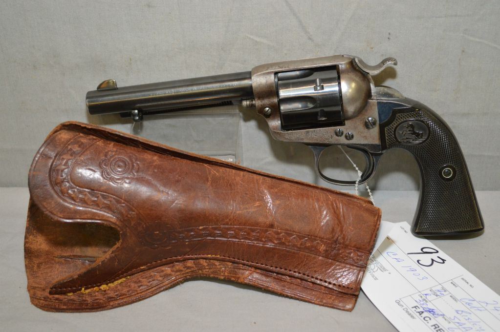 Colt Model Bisley Single Action Army .38 Special cal 6 Shot Revolver w/ 140 mm bbl [ blued finish, fading front front & back straps, case colored receiver, hammer, starting to fade, good checkered Colt insignia grips, matching numbers, Circa 1903, c/w old hand tooled leather holster , ( P316 ) ] Ser # 248297 Restricted Handgun Cert # 18267338