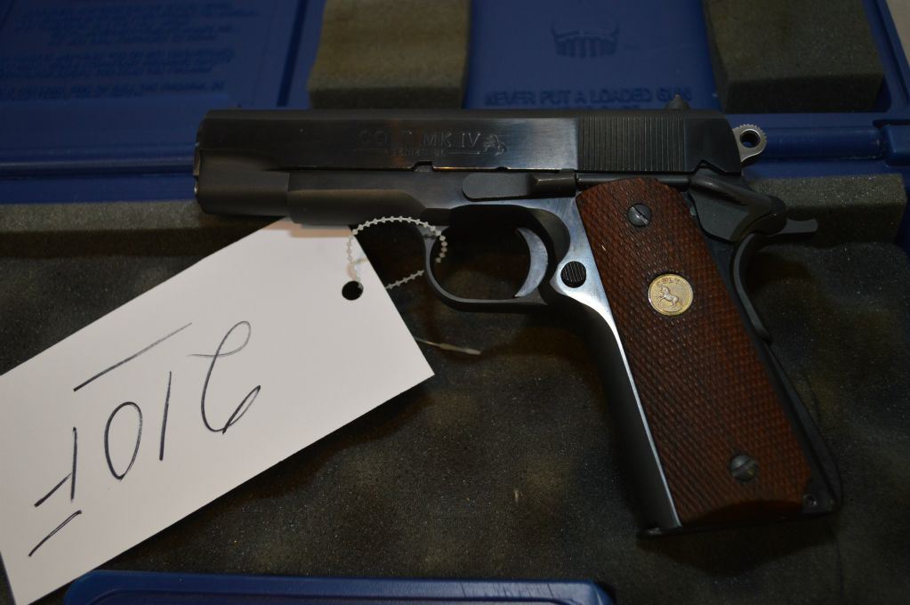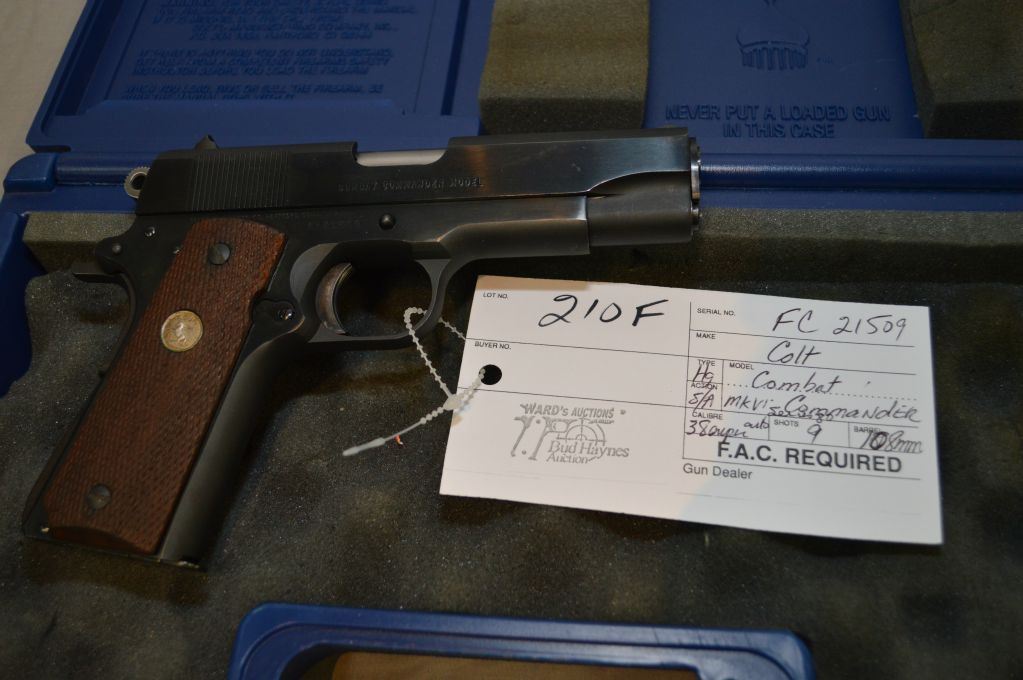 Colt Model Combat Commander Mark IV Series 80 .38 Super Auto Cal 9 Shot Semi Auto Pistol w/ 108 mm bbl [ blued finish, checkered wooden Colt insignia grips, c/w blue plastic foam lined Colt case ] Ser # FC21509 Restricted Handgun Cert # 17626164