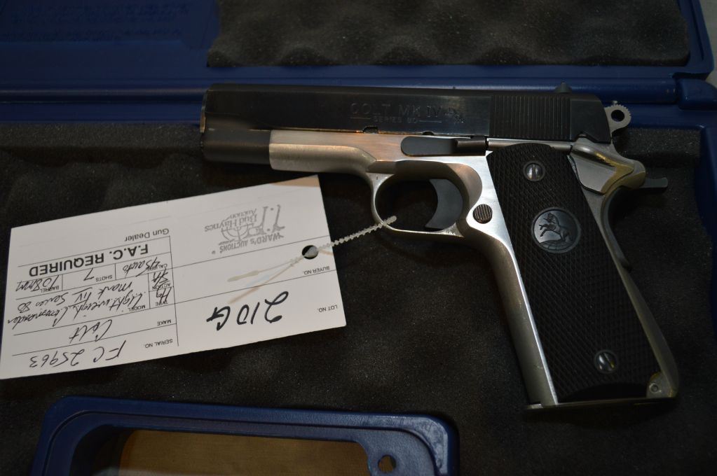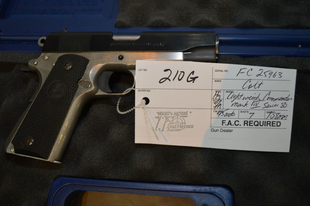 Colt Model Light Weight Commander Mark IV Series 80 .45 Auto Cal 7 Shot Semi Auto Pistol w/ 108 mm bbl [ blued finish slide, etc., stainless receiver barrel etc, black checkered Colt insignia grips, w/ foam lined blue plastic Colt case ] Ser # FC25963 Restricted Handgun Cert # 17746899