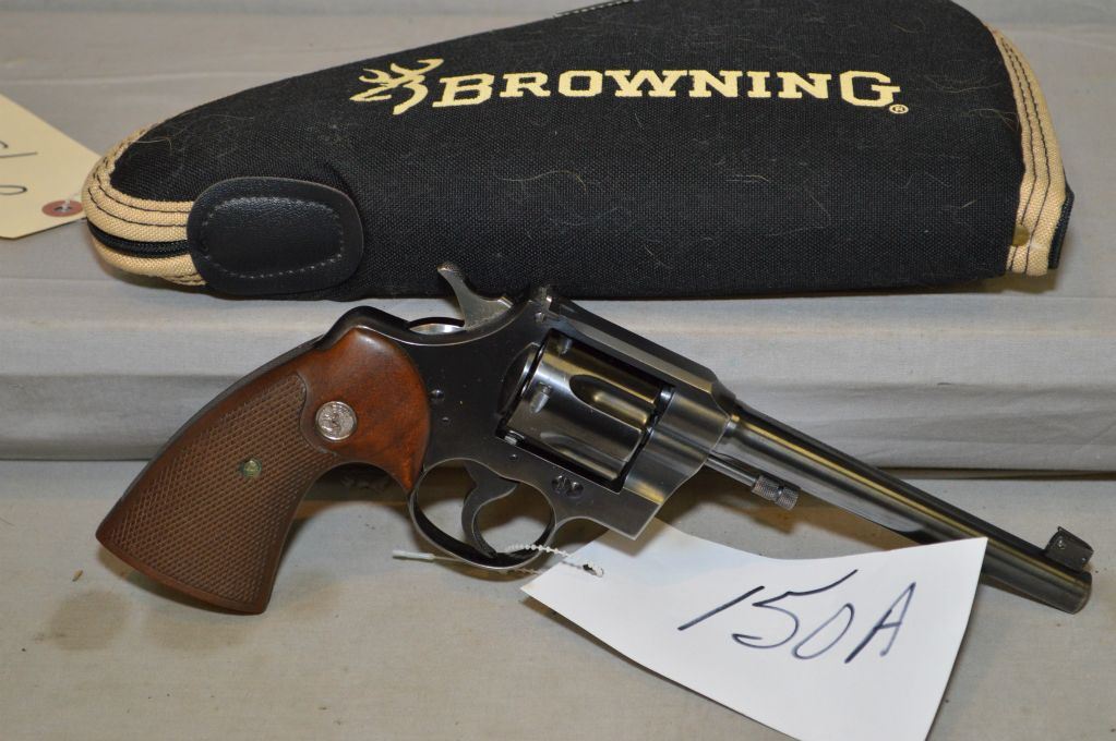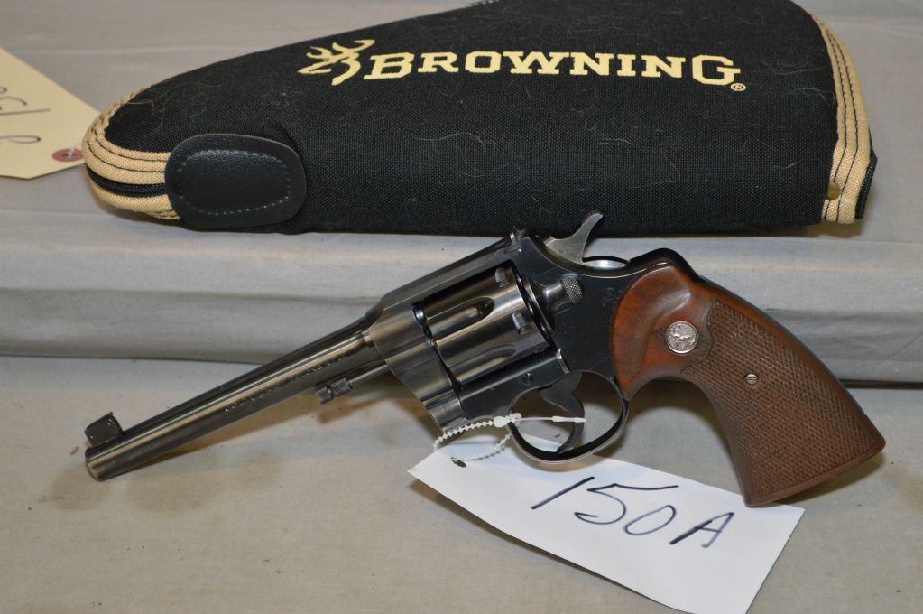 Colt Model Officer's Model .22 LR Cal 6 Shot Revolver w/152 mm bbl [ excellent blue finish with slight muzzle wear, slight cylinder ring, receiver has flat top w/adjustable rear sight, excellent checkered Colt insignia walnut grips, four digital serial number c/w Browning padded zipper pistol case ] Ser # 6097 Restricted Handgun Cert # tci old is K-229267