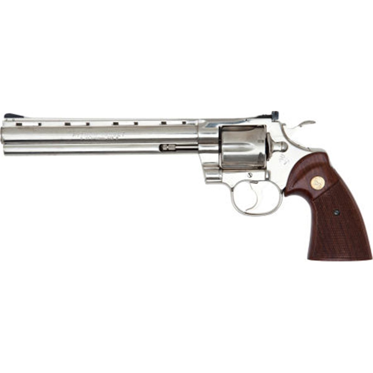 Colt Model Python Double Action Target Revolver. Serial no. K07650, .38 Special caliber, 8-inch barrel with elevated rib. Target sights. Nickel-plated finish. Factory checkered walnut grips with medallions [only 251 manufactured with nickel finish]. Condition: Very good. Retaining approximately 95-100% finish with scattered light wear and fine scratches present. Grips with light handling wear. Action crisp.NRA FIREARMS FOR FREEDOM PROGRAM