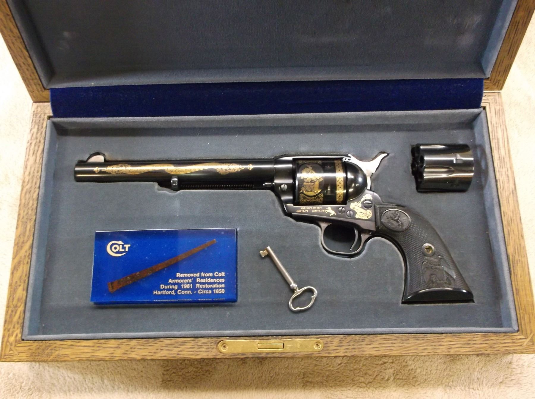 Colt Model Rusty Nail Revolver- .44-40 WCF- 7.5" Barrel- Gold Inlaid Barrel, Cylinder and Receiver- 1982- Extra Cylinder- Locking Box With Key- Circa 1850 Rusty Nail- #SA60112